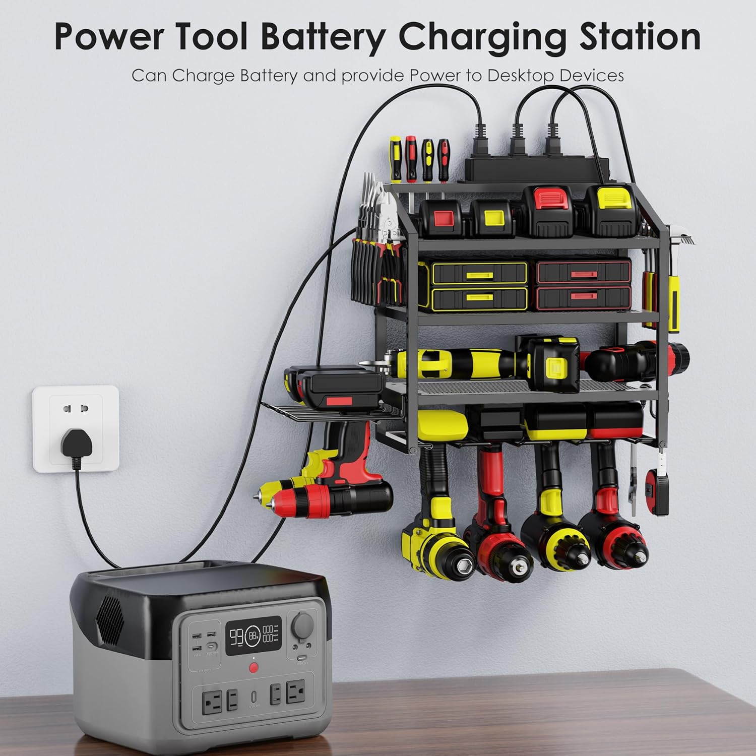 - Upgraded Tool Organizer with Charging Station: The power tool organizer with power strip is equipped with 6 outlets and is very convenient for charging tool batteries. This power tool organizeris suitable for a variety of places such as garages, tool rooms, yards and more.