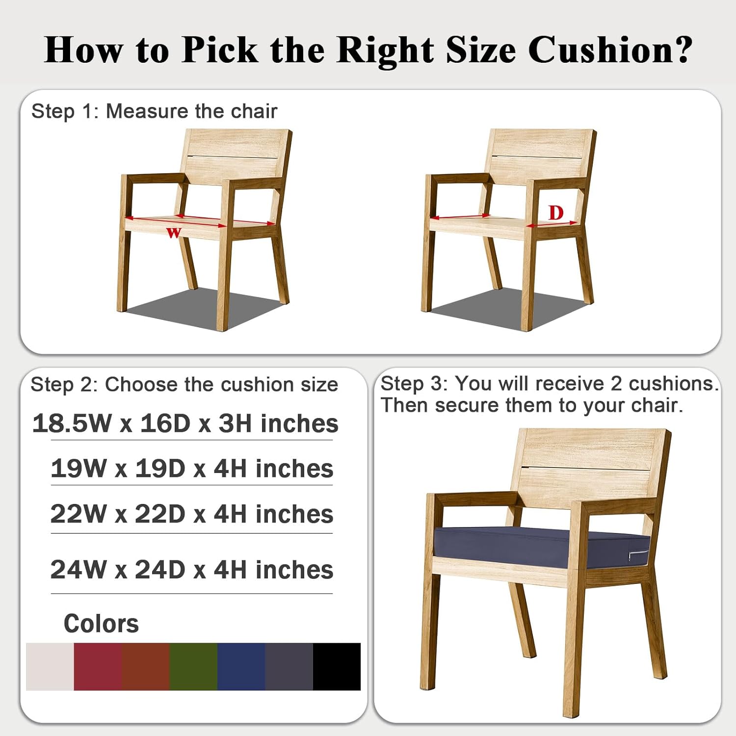 • PERFECT SIZE: Outdoor chair cushion set includes 2 cushions. Cushions measure: 18.5 inch (W) 16 inch (D) 3 inch (H). Fits most standard size outdoor chairs. Since the outdoor cushions are vacuum-packed, it may take 24-51 hours for the cushion foam to fluff back up after opening the vacuum bag