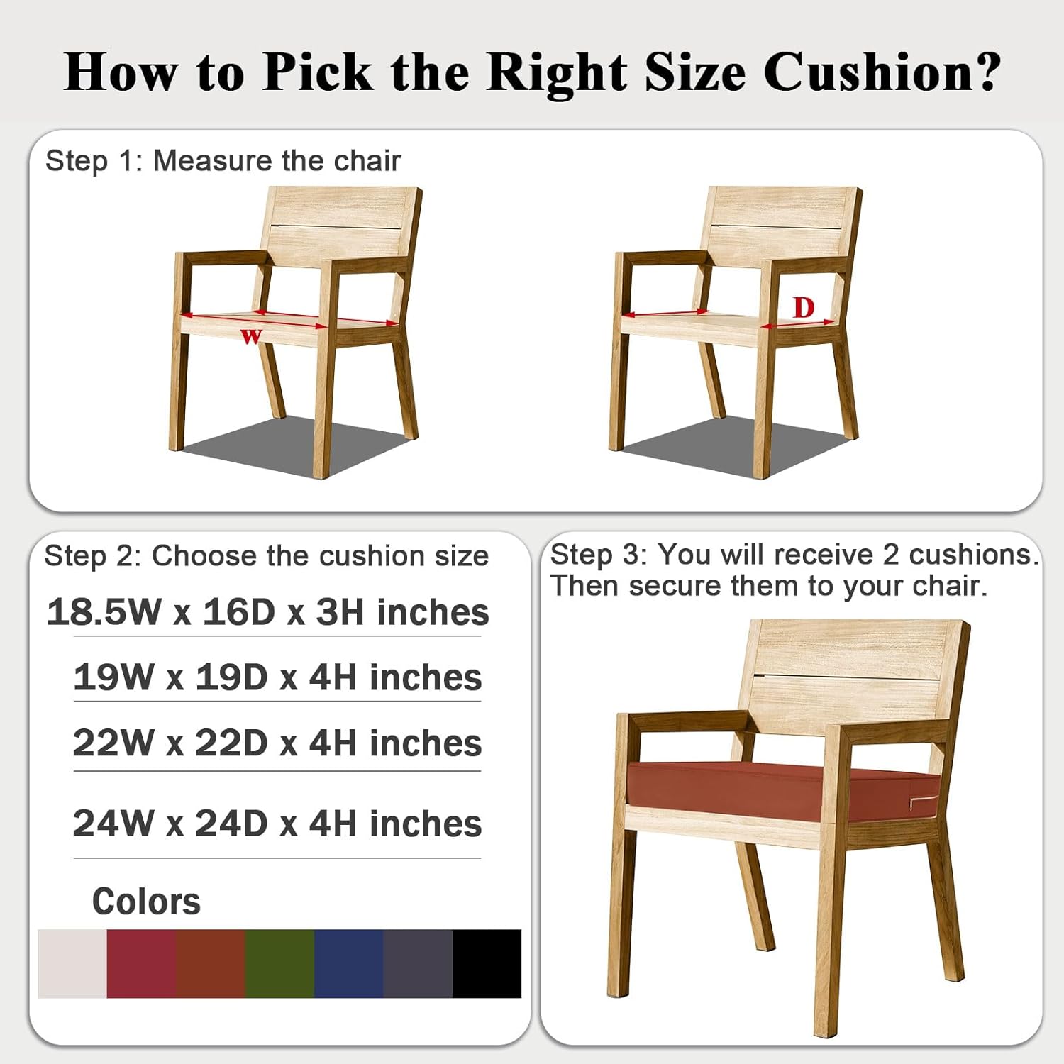 - PERFECT SIZE: Outdoor chair cushion set includes 2 cushions. Cushions measure: 18.5 inch (W) 16 inch (D) 3 inch (H). Fits most standard size outdoor chairs. Since the outdoor cushions are vacuum-packed, it may take 24-54 hours for the cushion foam to fluff back up after opening the vacuum bag
