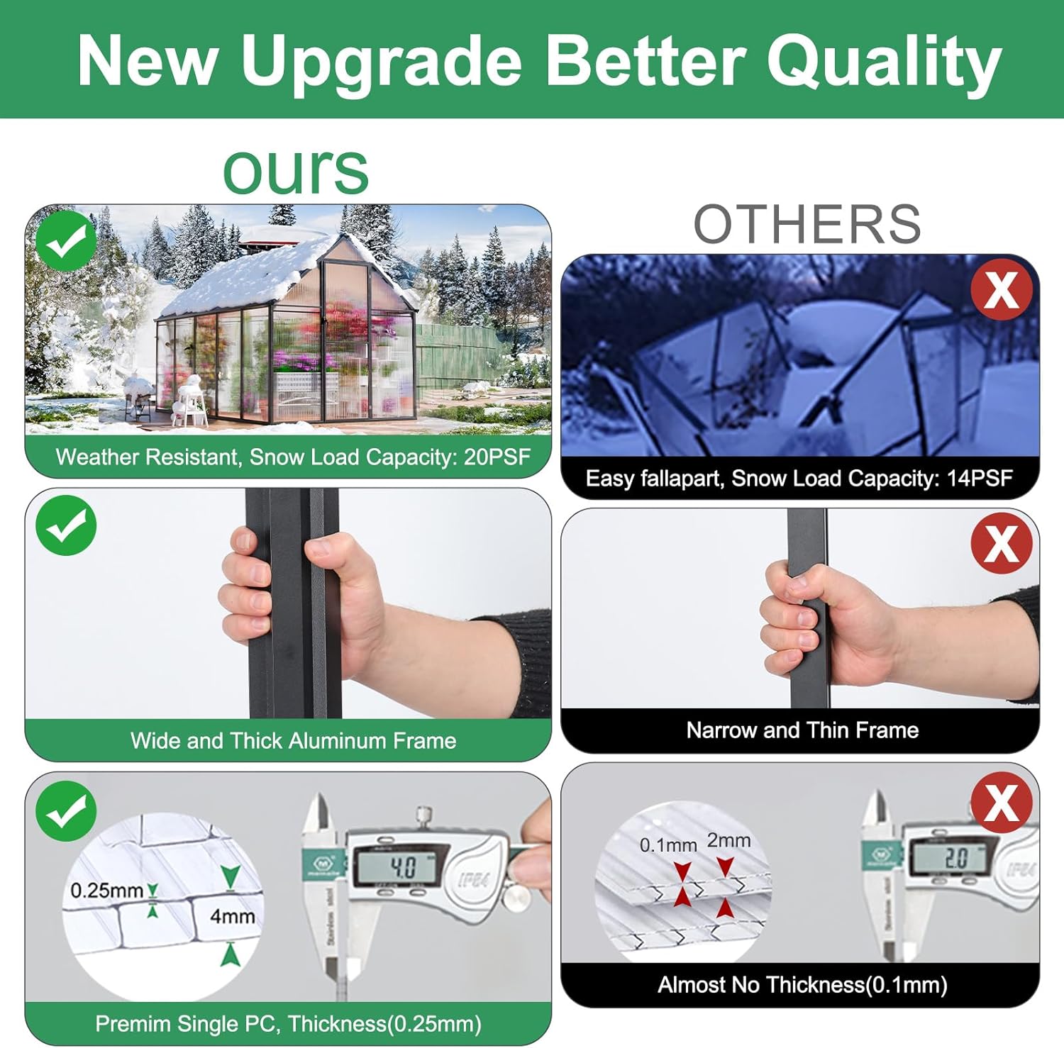 - Sturdy Frame: Our greenhouse kit boasts a robust rust-resistant aluminum frame designed to withstand various weather conditions. 2 skilled enthusiasts can assemble this greenhouse kit within just 4-6 hours. Introducing patented technology, Easy assembly, saving you 50% of your time. Gone are the days of tedious setups. With a simple push and locking screw, our Quick Connect ensures a reliable, secure, and swift link-up. It can also support snow loads of up to 20PSF