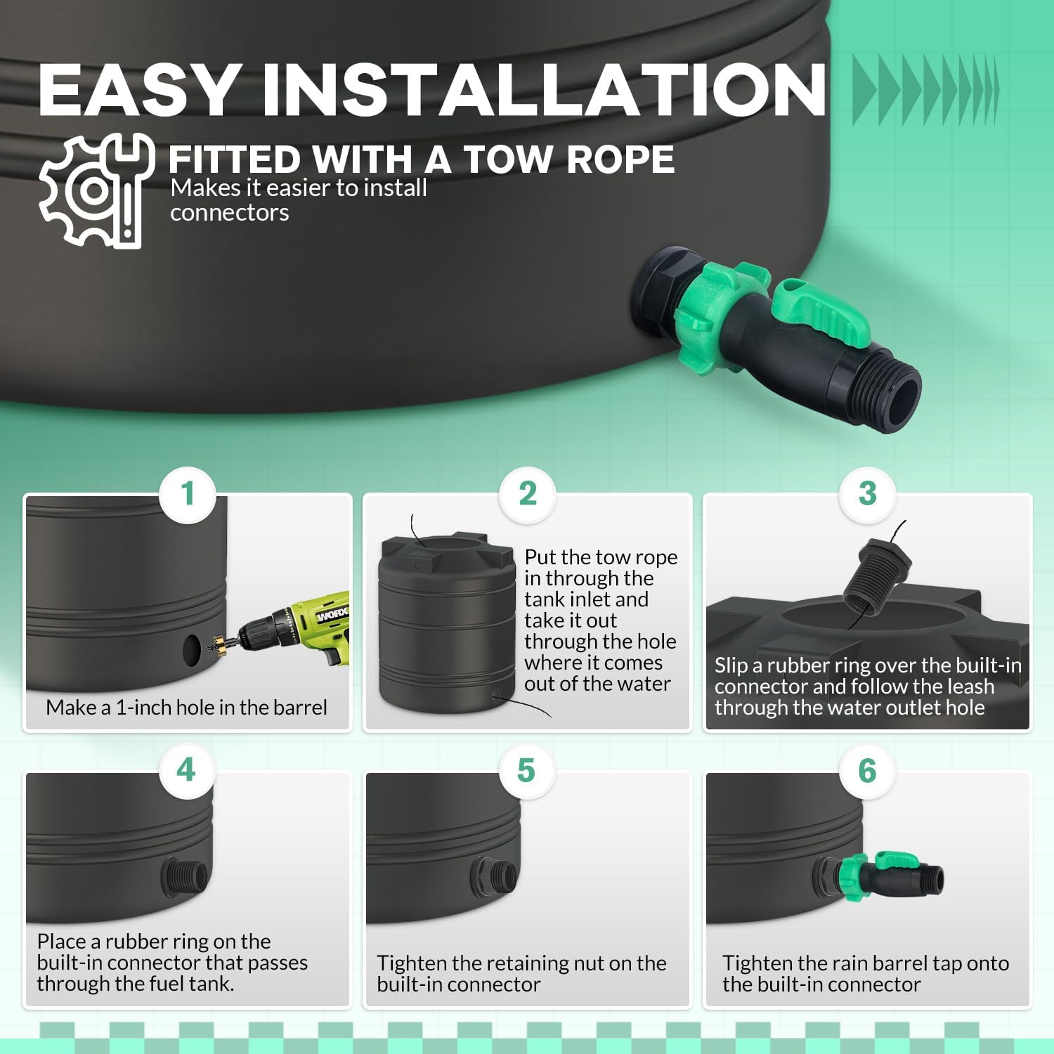 - Perfect Configuration: The rain barrel spigot kit is equipped with 2 pcs 180 degree Water Hose Shut Off Valve, 2 pcs garden hose bulkhead fitting, 2 pcs pipe tapes, 2 pcs traction ropes, and 4 pcs rubber gaskets. The perfect configuration makes this set more suitable for your needs and can also adapt to more places.