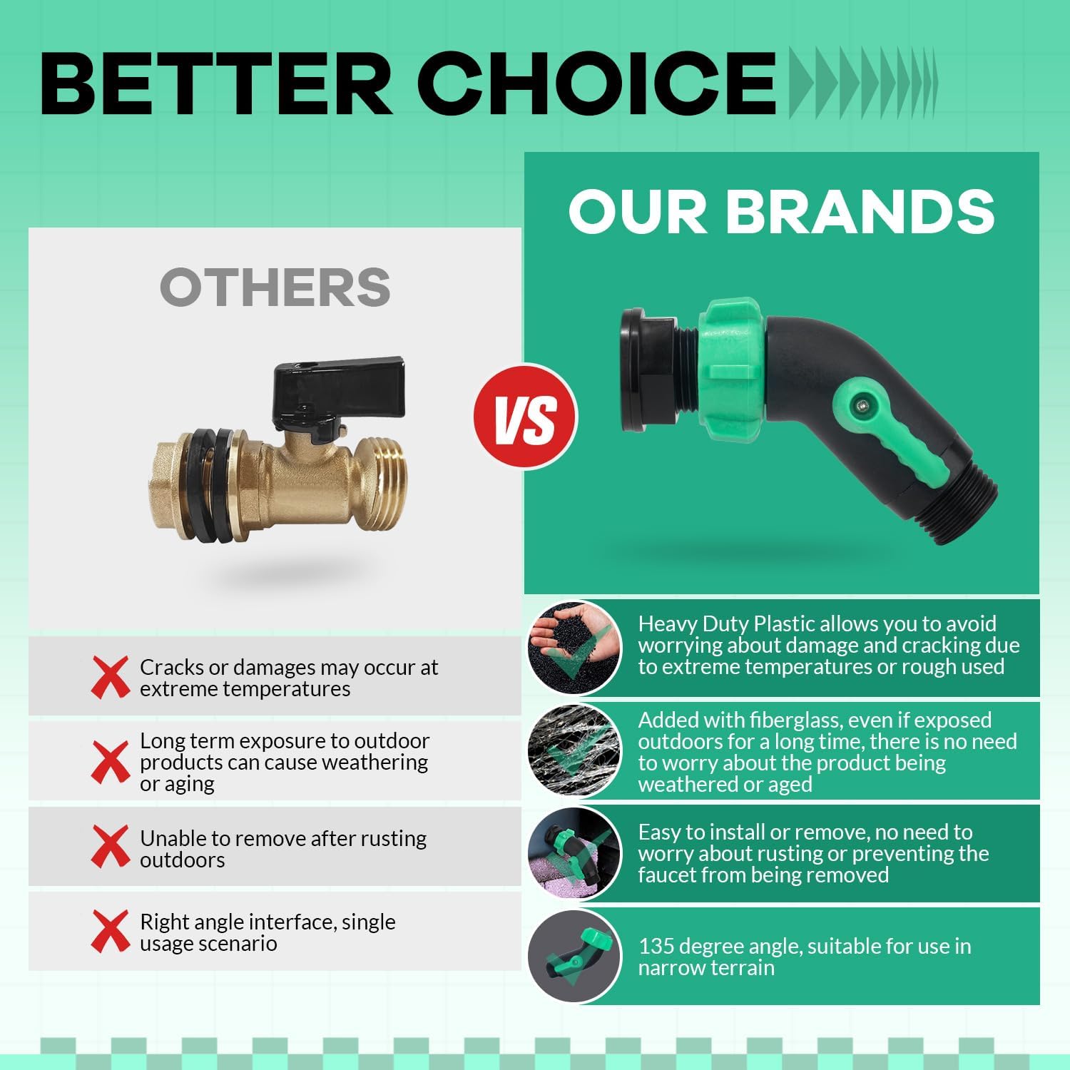 - User Friendliness: Our water barrel faucet is your perfect choice. After using the water hose shut off valve, simply flip the knob to turn it off. Can be used with hose nozzles and easily replaced or unscrewed without spraying water onto you.