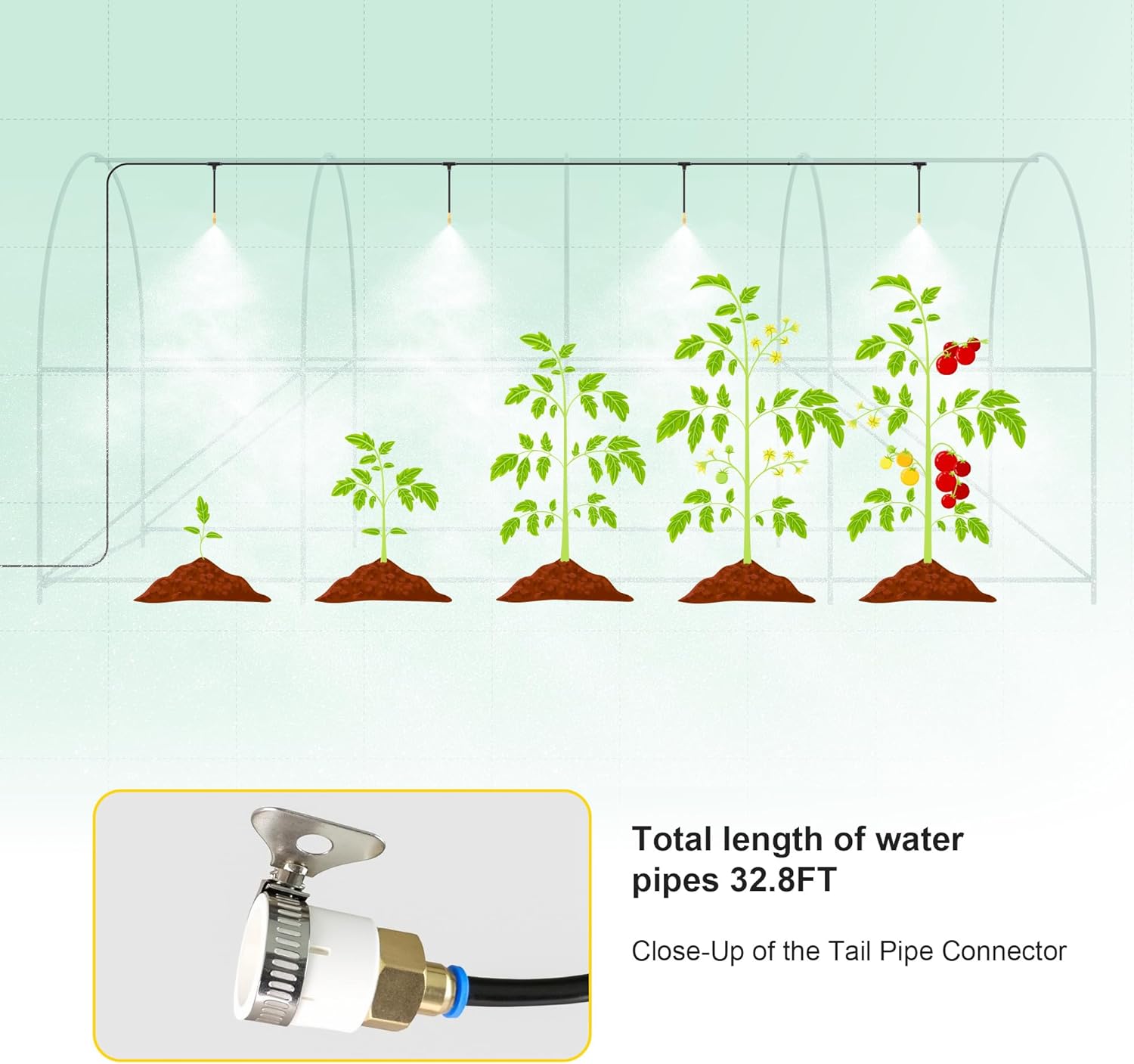 - 【New Spraying System】Our sunroom is equipped with a spraying system, 32’ long water pipe can be cut according to your needs, just connect to the water source, you can easily realize automatic watering. 3 removable nozzles can be bent to different angles and come with 3 spraying modes to provide a good growing experience.