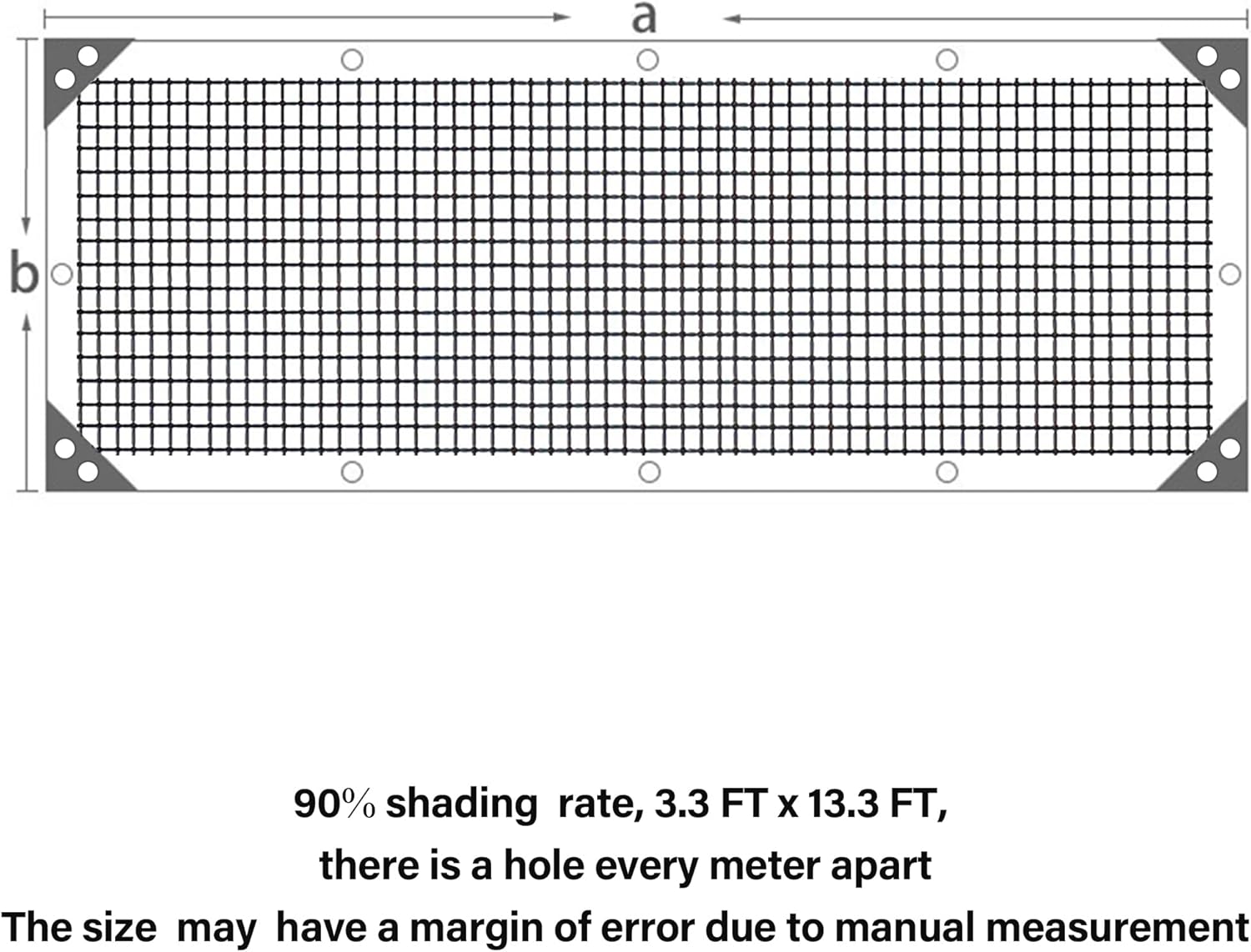 - High Shade Rate: The garden mesh tarp measures 3.3 x 13.3 FT. Our Shade Cloth can resist rays and most sunlight while air can still flow through so as to create a comfortable cool and shaded place for people or plant. It blocks 90% of the sunshine and bring 10% the shadow, so 10% of the sunshine can through it.