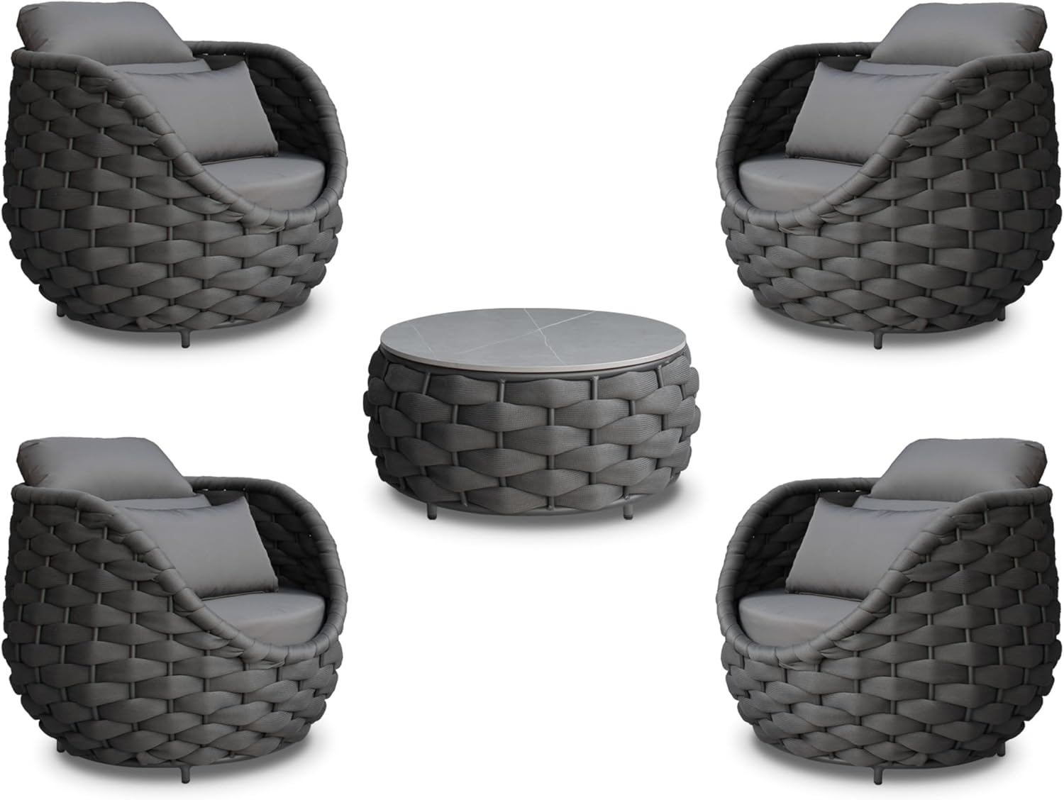 - Woven rope patio set includes: 4*sofa armchairs, 1*coffee table. Size: Single sofa: 34.3''(L)X34.3''(W)X27.6''(H) holds up to 400 lbs/181.5kg; Side table: 28.4''(L)X28.4''(W)X14.2''(H) holds up to 176 lbs/80kg. Color: Dark gray rope and dark gray fabric