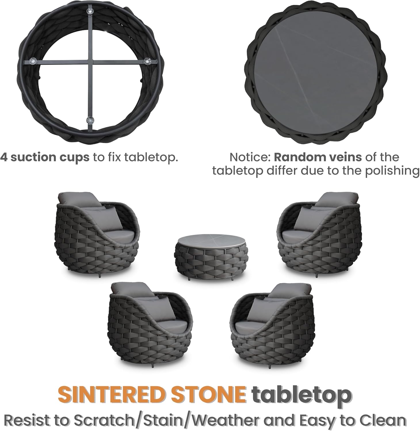 - Easy cleaning and scratch-resistant sintered stone tabletop is fixed by 4 suction cups. Cushions cover replaceable removal and machine washable. Adjustable nylon feet levelers for uneven floor also prevent scratching