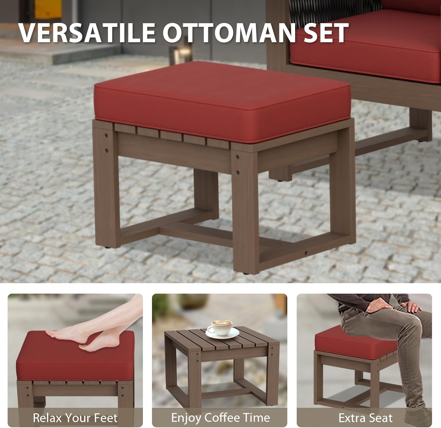- VERSATILE USE: This conversation set includes a 3 seat sofa, 2 patio chairs, 2 matching ottomans and a small sqaure side table. The real wood table is embossed to show the natural hues. It's outdoor weather resistant quality makes it ideal for patios, decks, porches, and poolside areas.