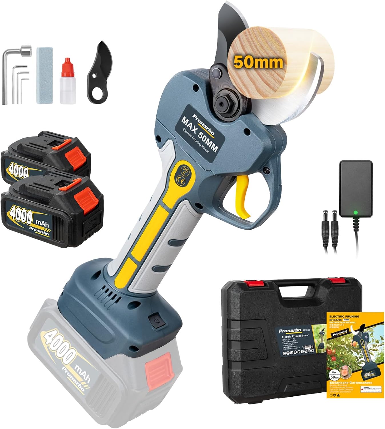 - 【Efficiency & Durability】PR-E50 battery powered pruner is equipped with a Max 900W brushless motor which is more efficient, run 50% longer, 25% more powerful, 10% longer life. It delivers more power with lower energy consumption. The blade of electric pruners cordless is made from Japanese SK5 high carbon steel with teflon coating, which is sharp and resistant to wear and tear. It help you complete your pruning tasks easily and efficiently.