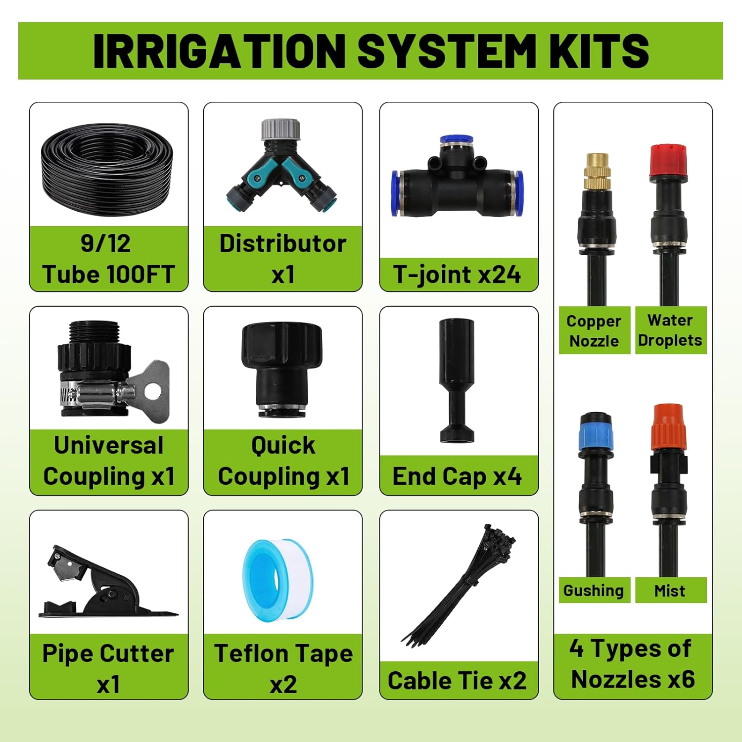 Drip Irrigation Kit - 100 FT. Hose Sprinkler System with 360° nozzles and T-connectors for Gardens, lawns, Plants, Flower beds, Trees, patios and hydroponics (24 360° nozzles + 24 T-connectors)