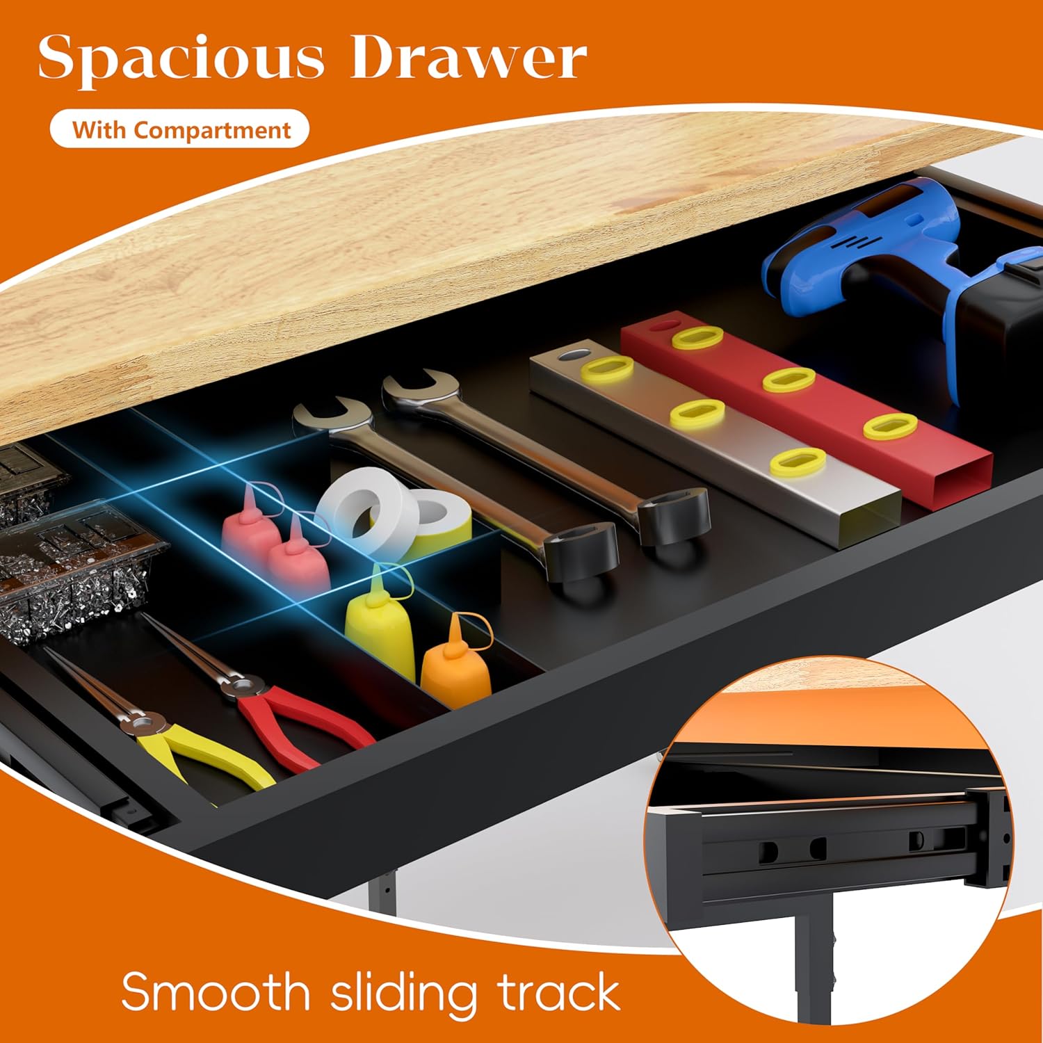 - Heavy Duty Workbench with Drawer: Features a 2" deep drawer with high-quality smooth slides supporting up to 100 lbs. Spacious enough for screwdrivers, wrenches, and small power tools. Includes a removable iron compartment, placeable on the left or right side for flexible storage.