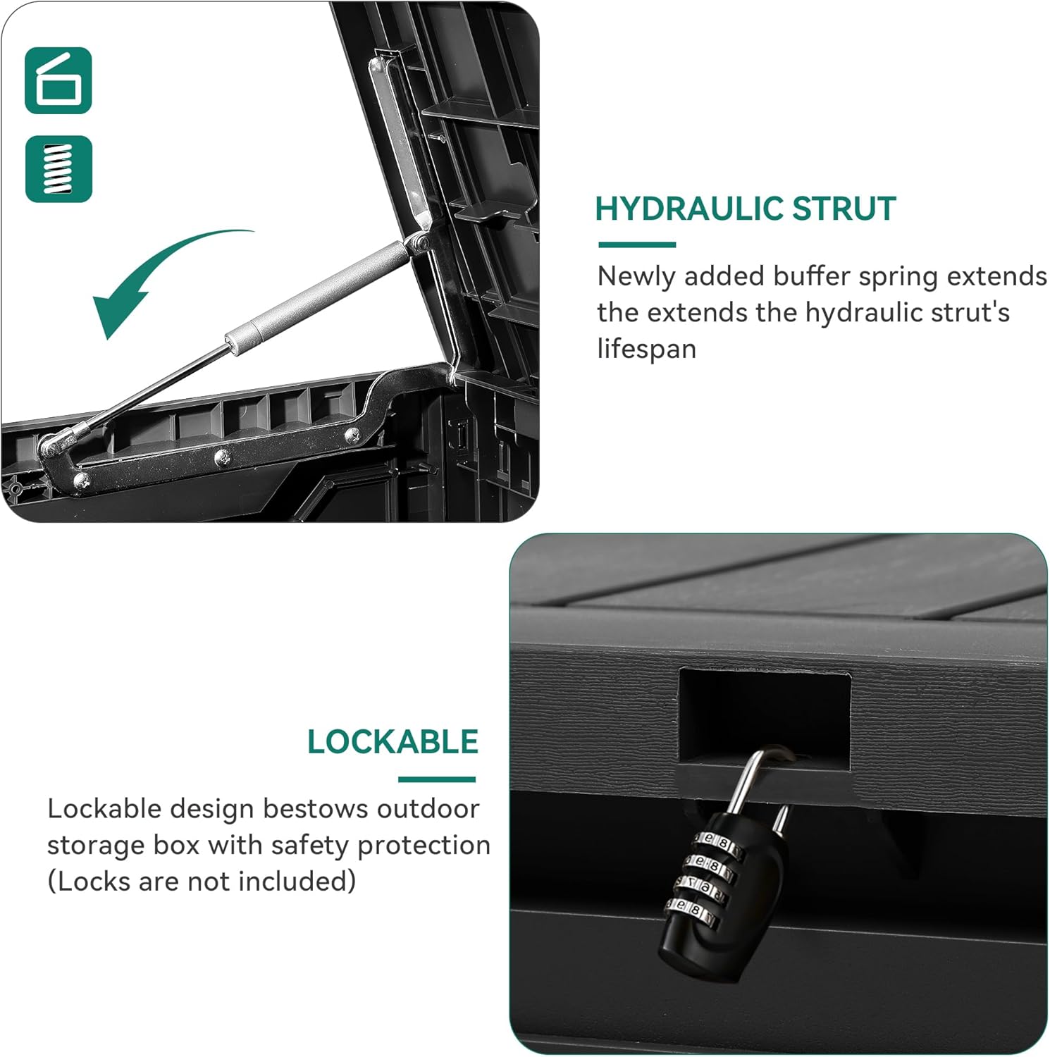 - Versatile and Secure: Our resin storage box is designed for both indoor or outdoor use, suitable for storing patio furniture cushions, gardening tools, pool accessories, and more; The deck box with lock design ensures your items stay safe and secure