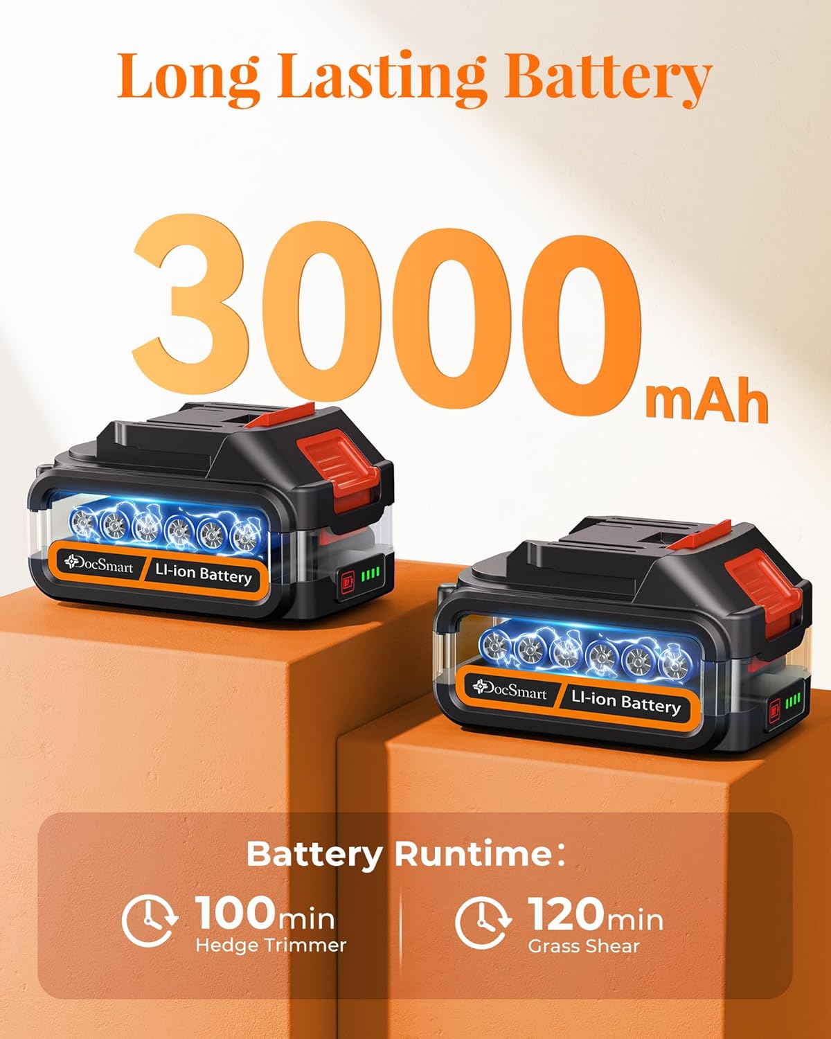 - One-hand Operation: DocSmart hedge trimmer comes short blade fully assembled with oil pre-coated to reduce wear and tear, simply plug in the fully charged battery and start using it. Ergonomic and non-slip handheld design ensures a comfortable grip and easy control. It can be used with one hand( 2.7 lbs), and it is not easy to get tired after long-term use. User-friendly for family and temporary work, even the elderly can easily control it