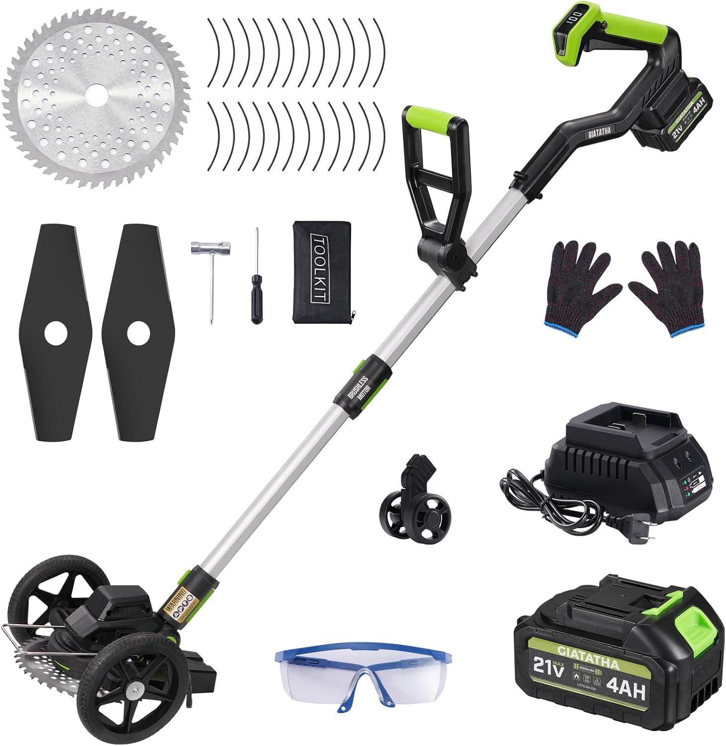 - Perfect for Small Urban Yards: This lightweight, battery-powered weed eater effortlessly maintains tight spaces and edges precisely around obstacles (flower beds, fences, sidewalks, trees, decor) without causing damage. Easily handles slopes, gravel, or uneven ground where heavy mowers struggle. Enables quick touch-ups for crisp edges along driveways, walls, or patios. Quiet operation makes it easy to maneuver even in noise-sensitive areas; wheeled design is accessible for seniors and all users.