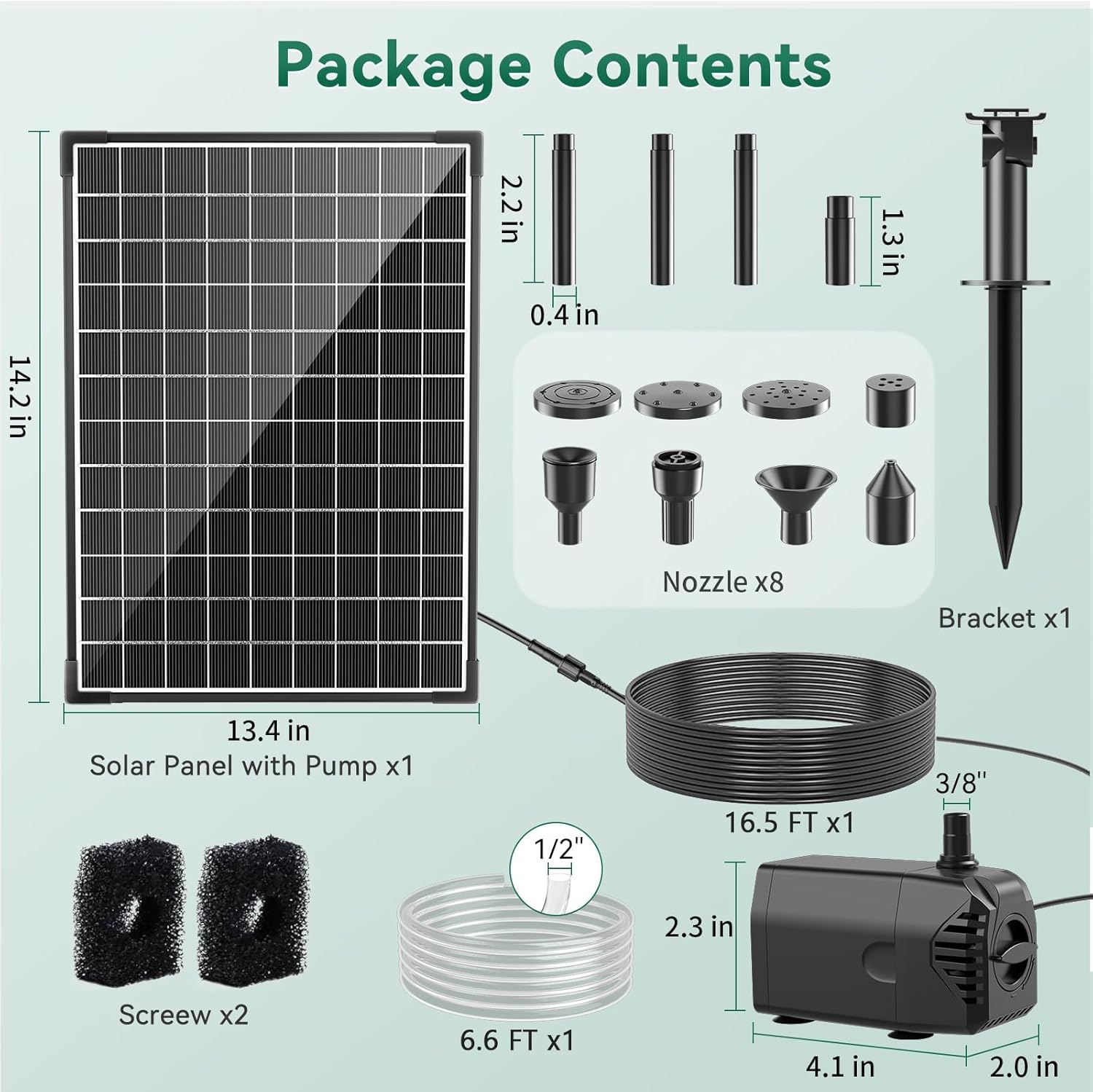 - ⛲【Warm Tips & Perfect Service】 1. The solar pond fountain does not work at night and completely cloudy. 2.The solar water pump for fountains should be cleaned regularly. 3.The panel should to face the sun and ensure not been shaded. 4. Solar water fountain pump must submerged when running. If there is any problem, please let us know, we have professional after-sales support team and will solve it for you quickly.