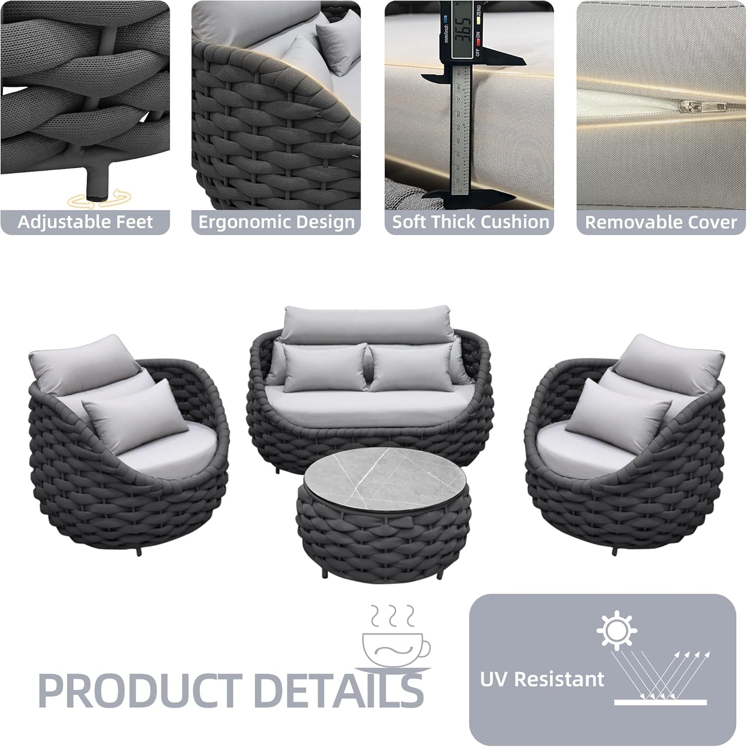TWT Patio Furniture Sofa Set 4 Pieces Aluminum Outdoor Furniture w/27.8in Coffee Table,Patio Conversation Set with Dark Grey Textilene Rope Grey Cushions for Sunroom Backyard Poolside Indoor