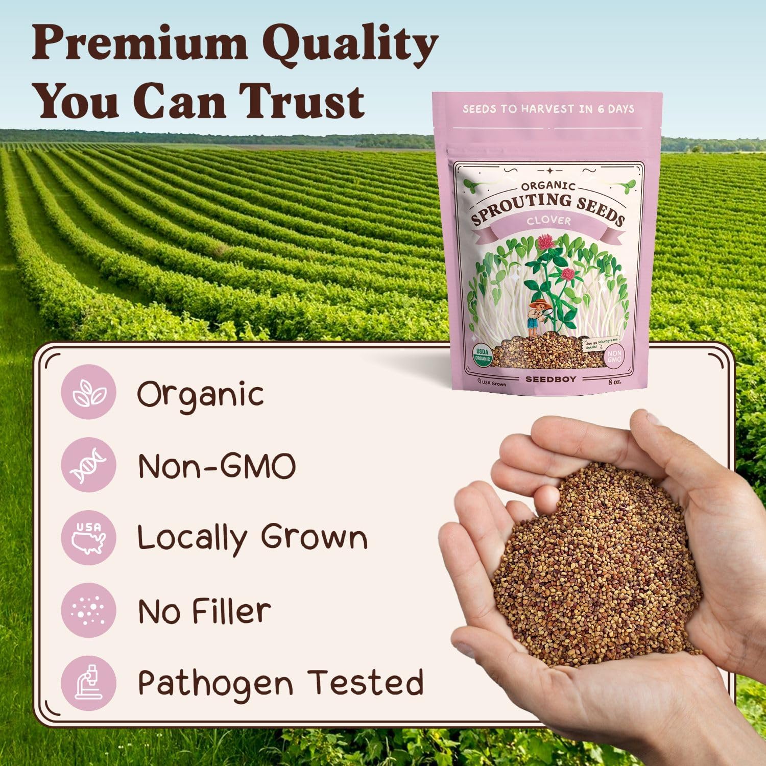 Seedboy Organic Clover Seeds for Sprouting - Non-GMO, USA Grown Microgreens Sprouting Seeds Mix - Makes 8 Quarts of Sprouts, 24 Servings (8 oz) (Red Clover)