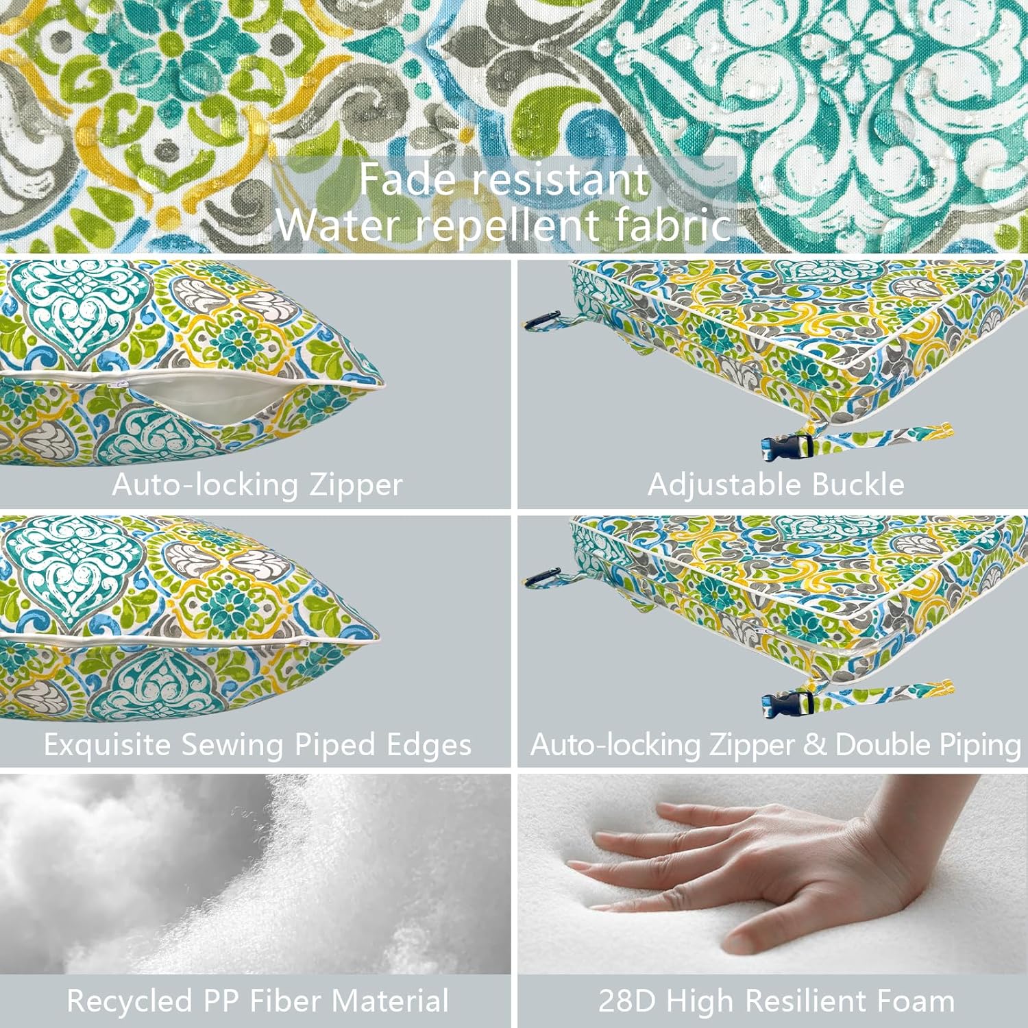 - ⭐Material: Made of 100% durable polyester fabric and soft filling material. It’s water repellent and fade-resistant. Won’t fading under the direct sunlight over 500 hours. Cushions are filled with 28D high resilient foama, overstuffed construction for enhanced comfort and longevity.
