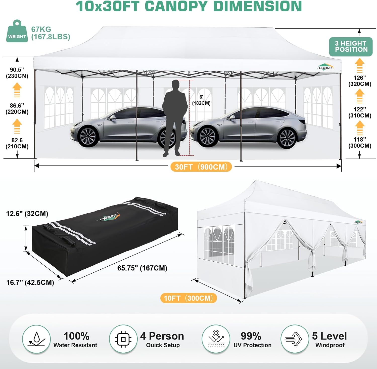 COBIZI 10x30 Pop Up Canopy Tent Heavy Duty with 8 Removable Sidewalls, Commercial Portable Tents for Parties Ez Up Canopy All-Weather Windproof & Waterproof and UPF 80+ Wedding Tent Sun Shelter