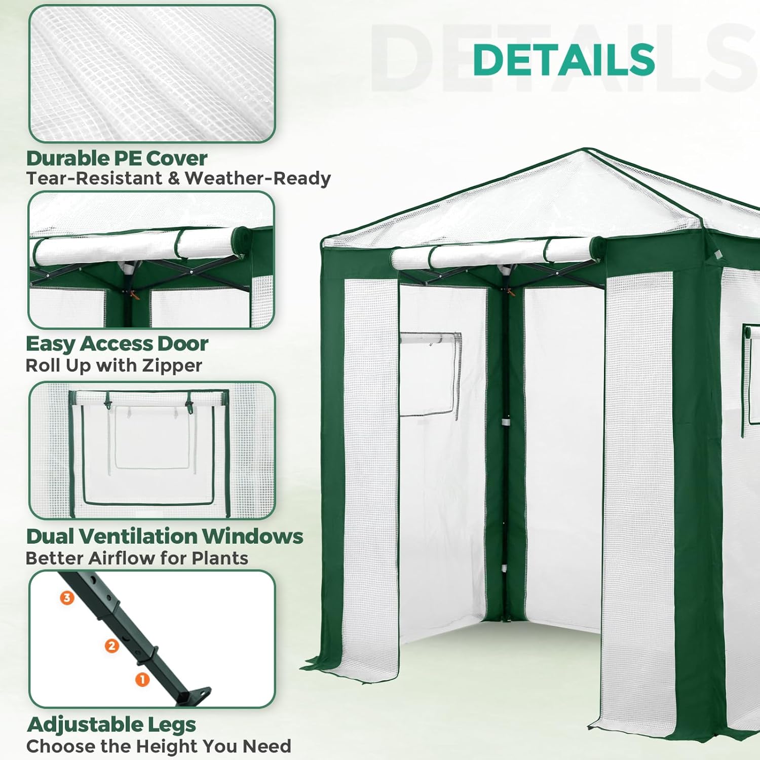 - PREMIUM COVER: This greenhouse comes equipped with a premium, scrim reinforced PE cover with polyester panels on the corners for extra seam strength. It is not only better for the environment, but also offers superior protection to your plants, unlike other greenhouses that come with cheaper Polyvinyl Chloride (PVC) covers