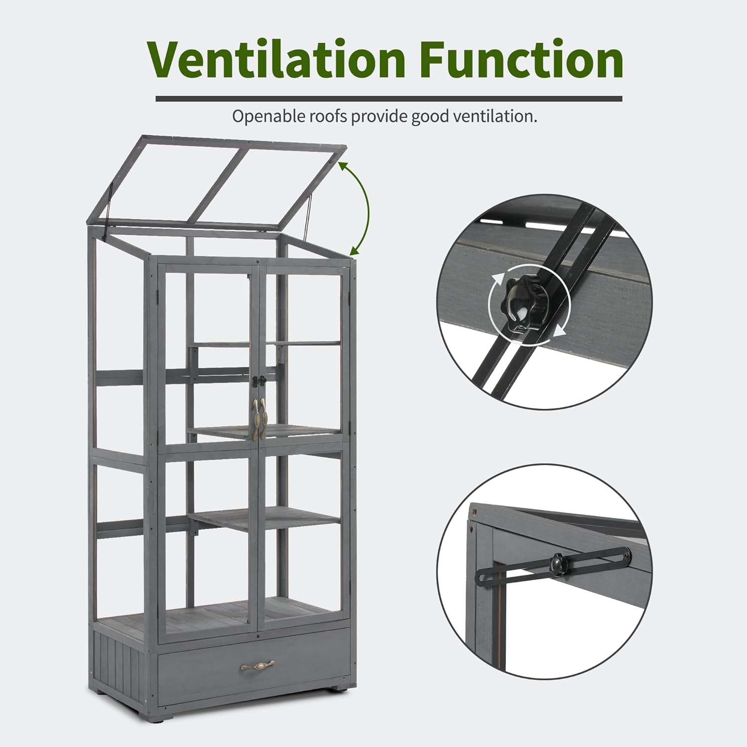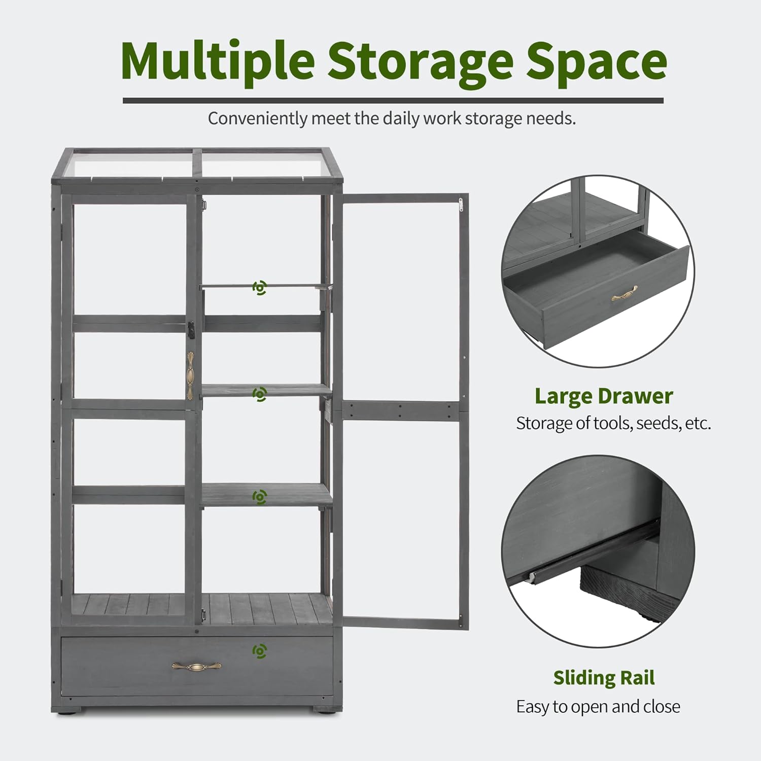 - One Push-pull Drawer: The wooden greenhouse includes a push-pull drawer, equipped with a high-quality sliding rail that ensures smooth pushing and pulling when used; You could store flowerpots, seeds, tools, etc. in it to keep the environment tidy