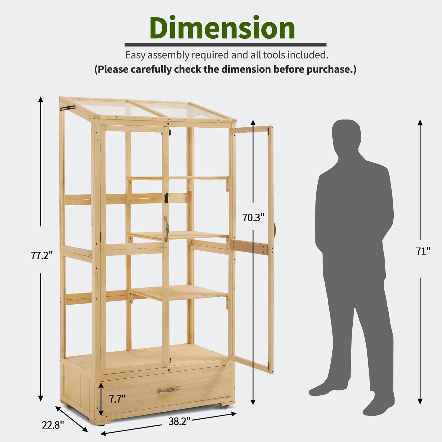 - One Push-pull Drawer: The wooden greenhouse includes a push-pull drawer, equipped with a high-quality sliding rail that ensures smooth pushing and pulling when used; You could store flowerpots, seeds, tools, etc. in it to keep the environment tidy