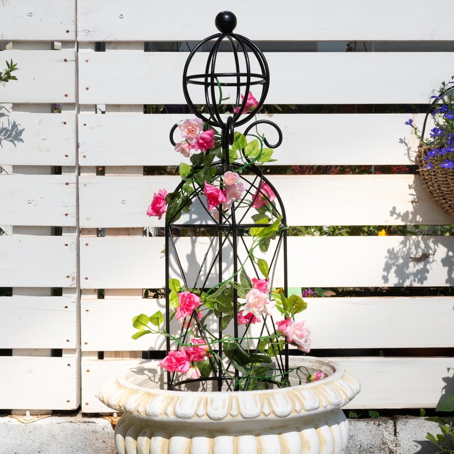 - - Premium-Quality Material for Durability: Crafted from premium iron metal, our garden obelisk trellis features a robust structure designed to withstand the elements. The black surface treatment not only enhances its aesthetic appeal but also provides exceptional corrosion resistance, making it ideal for supporting climbing plants both indoors and outdoors.