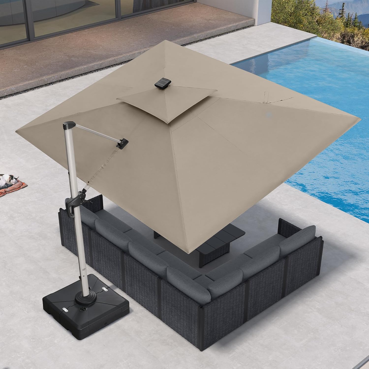 PURPLE LEAF 9' X 12' Solar Powered LED Patio Large Umbrella Offset Double Top Hanging Umbrella Outdoor Market Umbrella for Garden, Deep Beige