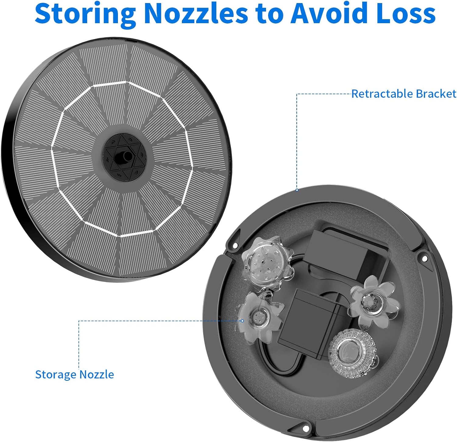 - [4 nozzle storage interfaces]: The upgraded solar bird bath fountain comes with the function of storing nozzles. Four nozzles can be stored on the solar powered fountain, and there is no need to worry about losing the nozzles of the solar fountain, which is very convenient to carry