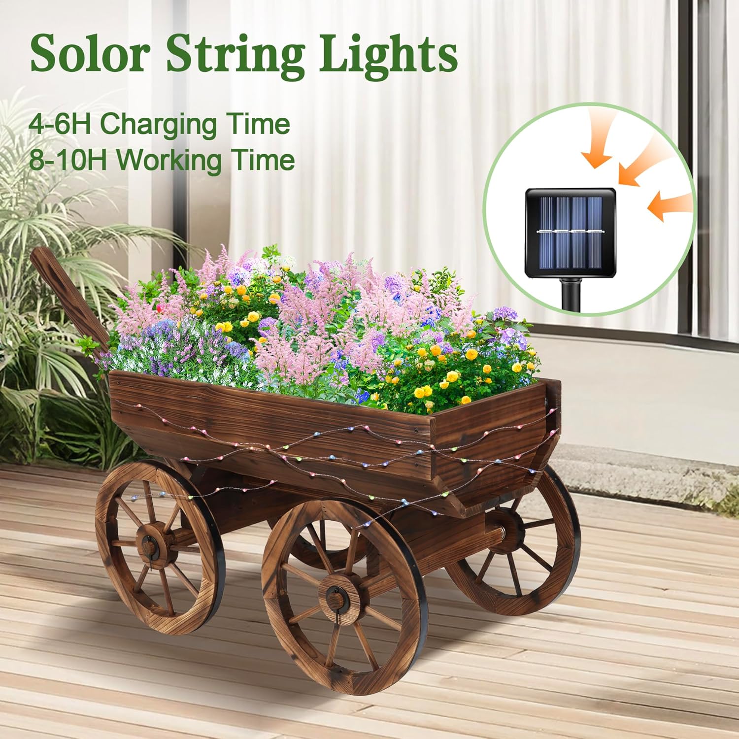 Wood Wagon Planter with Light for Outdoor Balcony Decor - Garden Rustic Wooden Flower Cart with Wheels for Outside Garden Decor Wheelbarrow Planter for Patio Christmas Decoration Gift Car