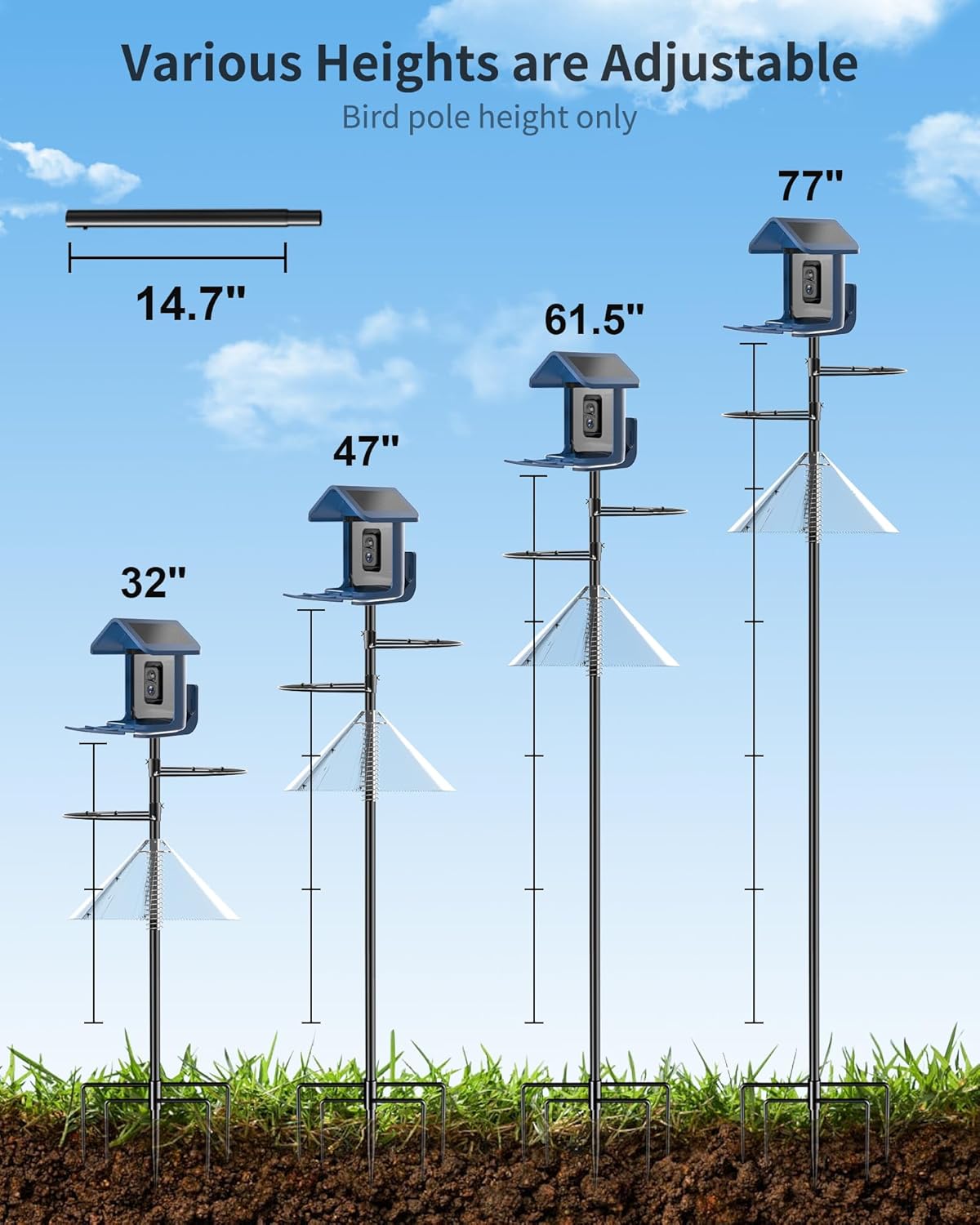 - 【Pole for Long-Lasting】The 5-prong base features a reinforced weld design for solid ground support, preventing breakage and ensuring durability. The thicker pole, 1-inch diameter and 1mm thickness, connects via a slip-in method for a depth of up to 5.5 cm between poles. This design is much stronger than the 1cm threaded connections, offering improved resistance to bending and breakage. It provides ample weight capacity, perfect for enduring storms, winter snow, and multiple bird feeders.