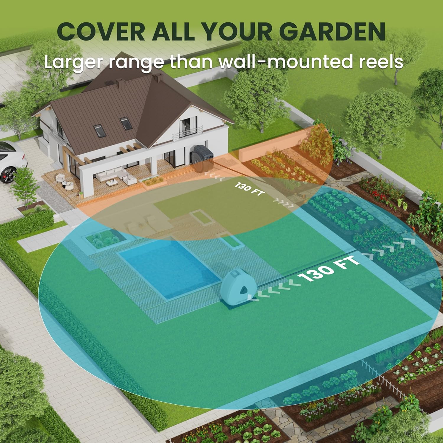 - WIDER COVERAGE, INVISIBLE STORAGE - This ground-mount reel enjoys 20% more coverage than wall-mounted rivals. Hide the reel discreetly behind plants, pull out the hose and lock at any length as you wish. A reel that hides as well as it works!