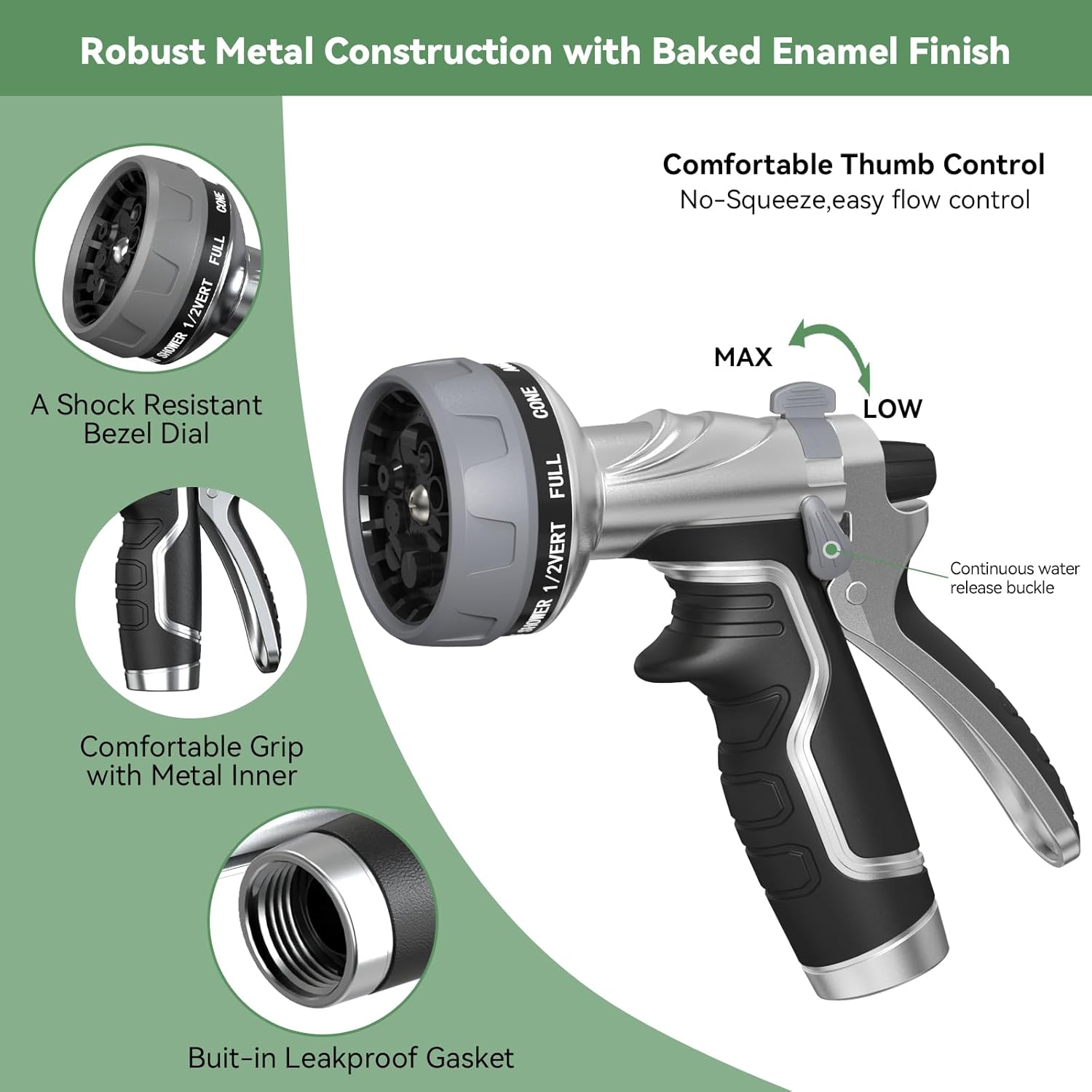 - **Upgraded Water Flow Control** Our newly upgraded garden hose nozzle features a thumb-controlled water flow valve. Simply slide the valve left or right to easily adjust the water pressure from a gentle mist to a powerful stream. The integrated design and internal rubber O-rings ensure a leak-free, tight seal for hassle-free use.