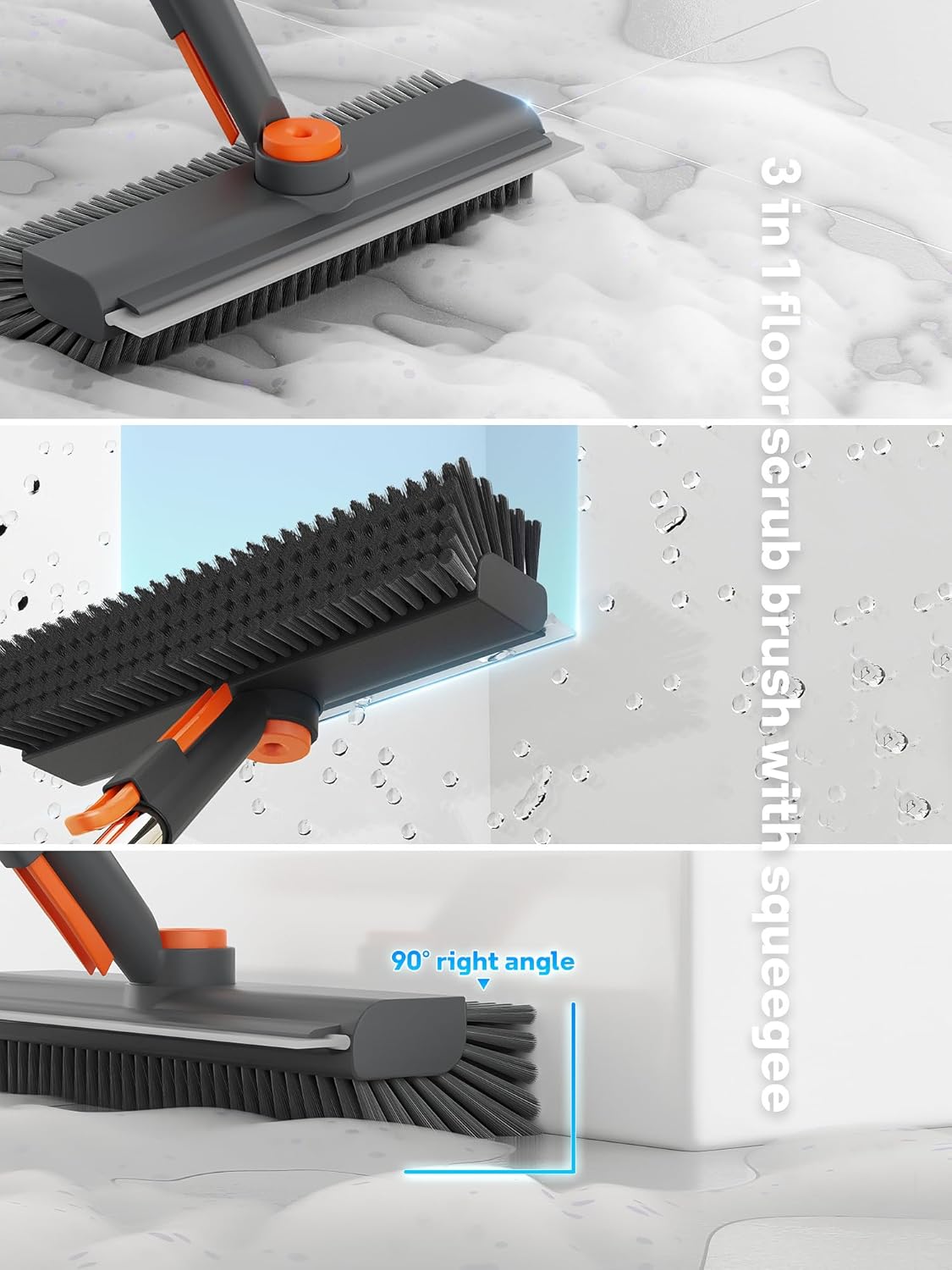 - 【Multi-scenario Floor Scrubber Brush】: Whether dry sweeping or wet scrubbing, this floor brush with squeegee adapts to all your cleaning needs. It’s effective on a wide range of surfaces or scenes including floors, tiles, mirrors, shower, deck, kitchen, bathroom and garage