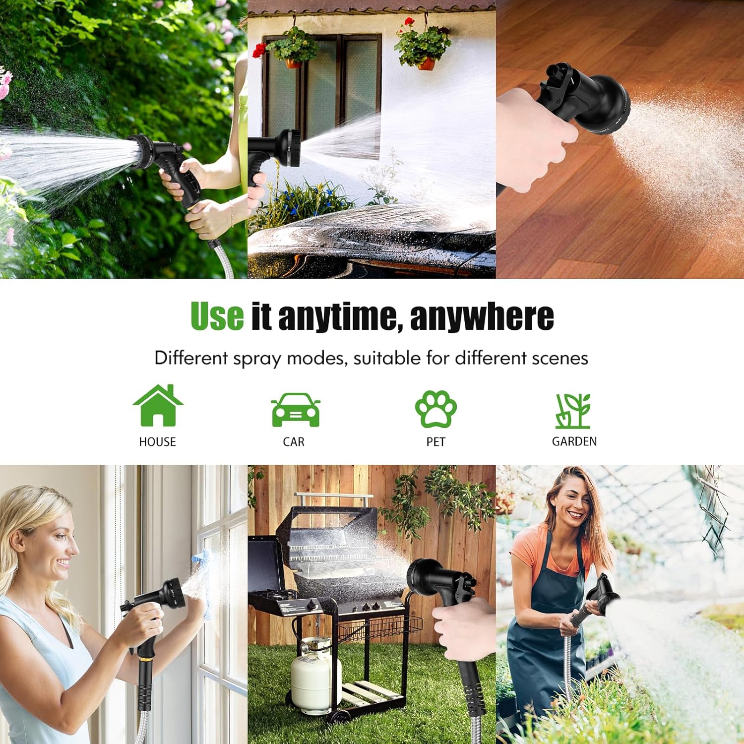 - Garden Hose Metal nozzle is made of metal zinc alloy and ABS plastic for greater durability and corrosion resistance. The thumb control makes this nozzle easy to hold and switch. In addition, the ergonomically designed nozzle grip features a non-slip rubber pad that is more comfortable to use and prevents slippage. The rotating baffle allows you to choose from 10 spray patterns to meet all your needs. Can be used for watering gardens and cleaning houses, cars, yards, pet bathrooms, and so on.
