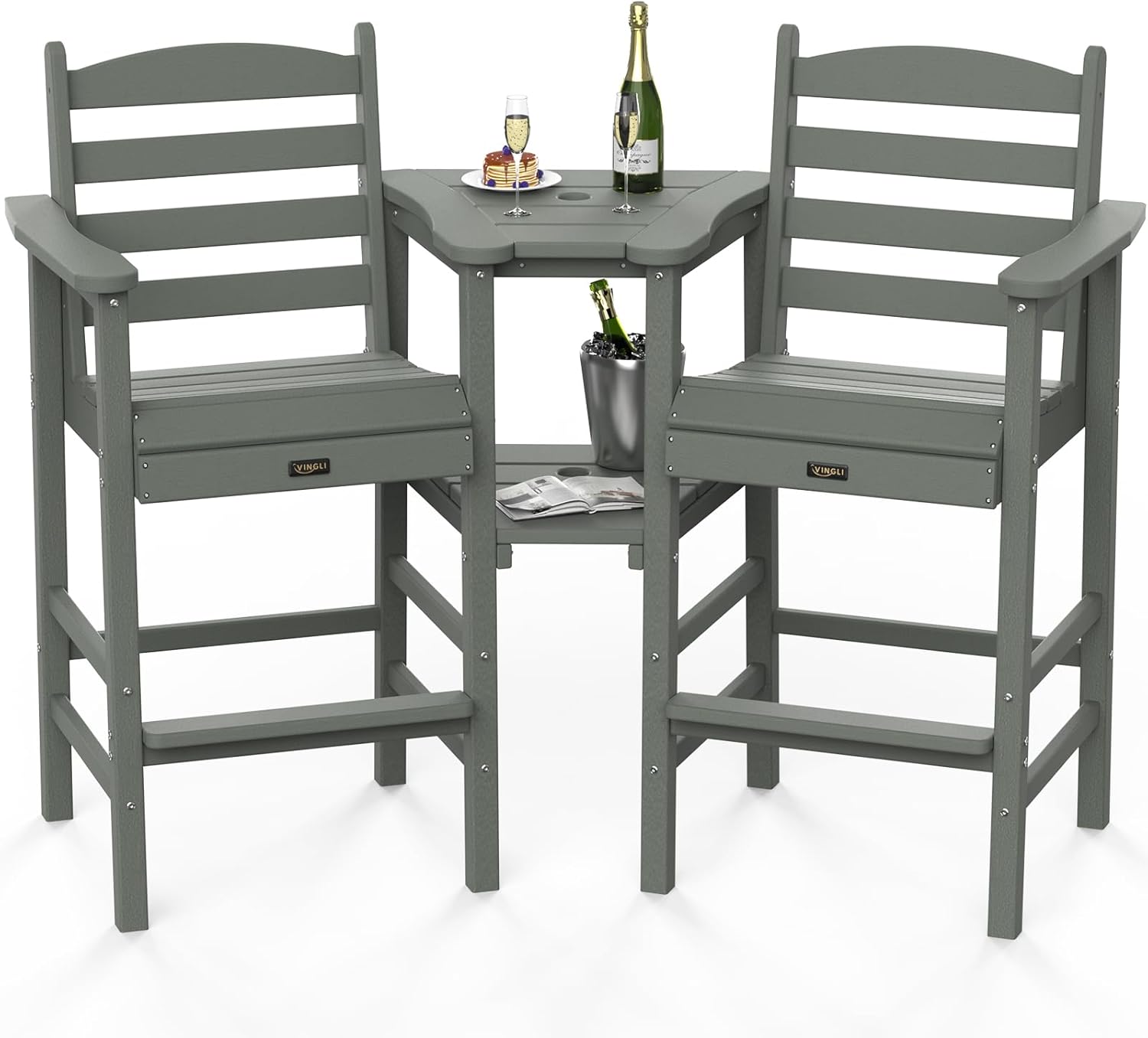 VINGLI Tall Adirondack Chairs Set of 2 with Removable Double Connecting Trays, HDPE Weather Resistance Outdoor Bar Stools Heavy Duty Patio Table and Chars Set Poly Deck Chairs for Pool Balcony (Gray)