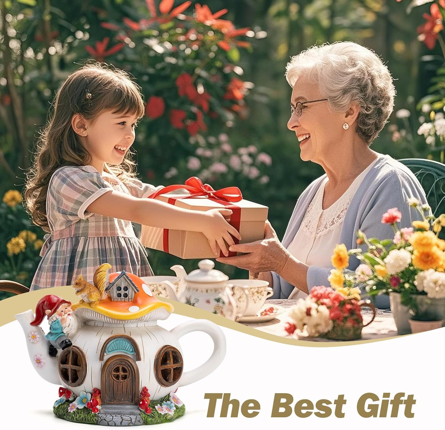 - Unique Mushroom Teapot Design: This solar-powered mushroom teapot light combines a whimsical mushroom house design with a charming garden gnome and a playful squirrel, creating a magical atmosphere in your garden or outdoor space.