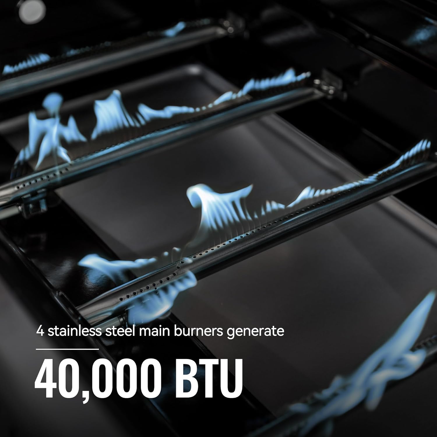 - Multi-Functional Design: This 5-burner propane gas grill is equipped with multi-purpose side shelves—a right-side shelf with a magnetic knife holder and a left-side shelf (flip down the side burner lid) with three hooks—offering extra prep & storage space; the right-side shelf can be folded to save space, adding convenience