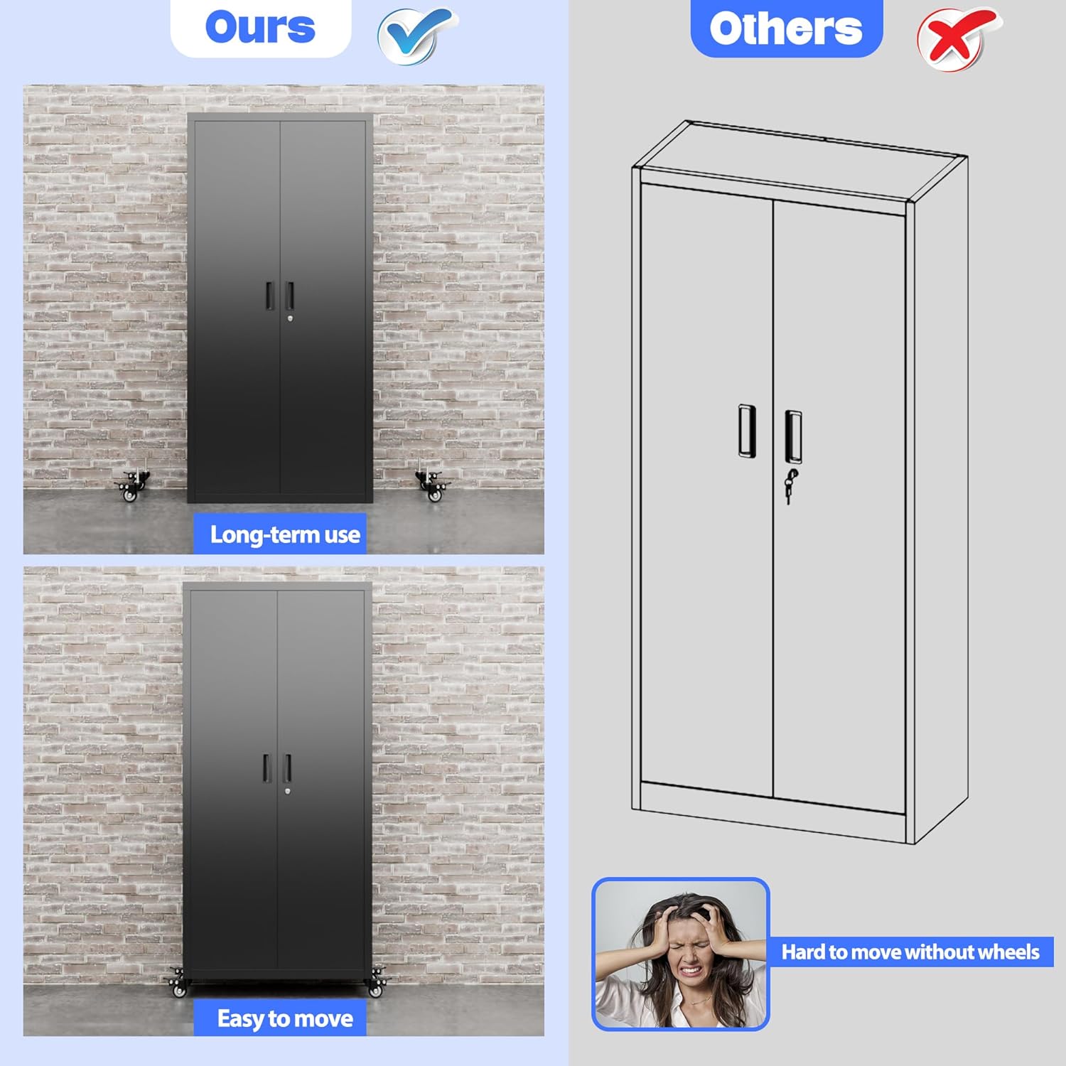 - Detachable Swivel Wheels with Lock: Metal storage cabinet with wheels has 4 lockable wheels,you can move them around as needed and The wheels are lockable and detachable and you can fix the cabinet where you want to place