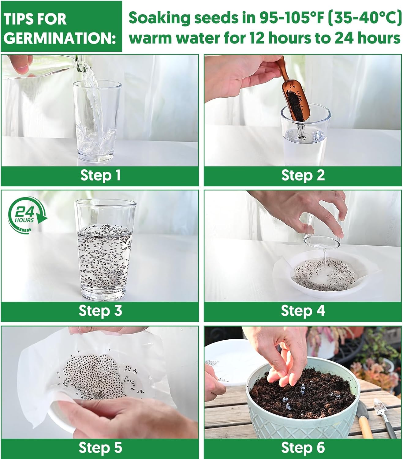 - Tips for Easy Germination: Soaking seeds in 95-105°F (35-40°C) warm water for 12 hours; for hard-coated seeds like cilantro and rosemary, extend soaking to 24 hours for improved sprouting. Or soaking those seeds in a wet paper towel until they get that gelatinous cover helps them sprout a little bit faster