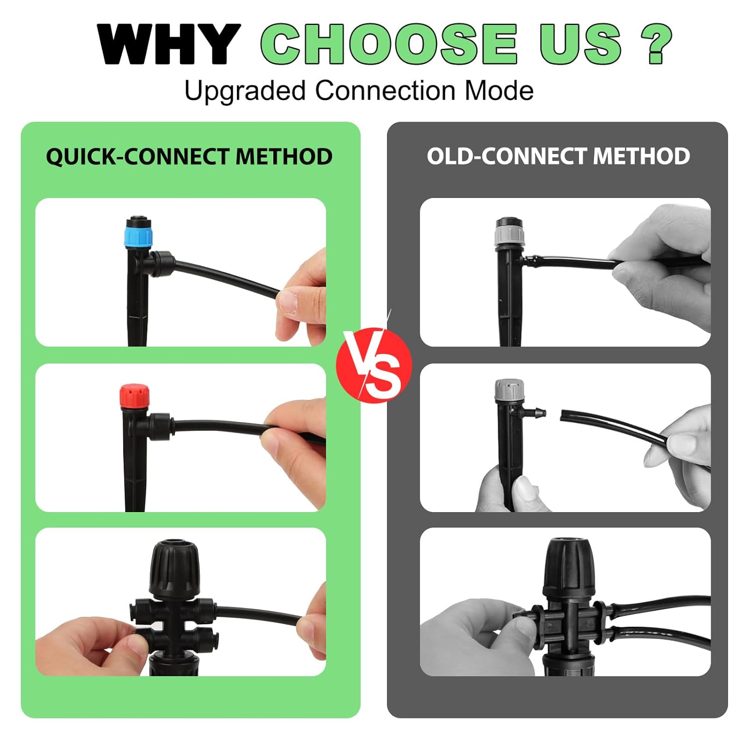 - 🔧【Plug & Play with Quick Connect Design】 : Featuring quick-connect fittings, simply plug and secure for a hassle-free setup. The connectors ensure a firm grip, preventing leaks and detachment. With a detailed user manual, you can easily create the perfect irrigation branches using four-way, two-way, and one-way couplers, ensuring even water distribution and minimal evaporation loss. We includes Instruction manual in the package, you just need to connect main tubing to faucet and then connect the distribution tubings and emitters according your needs.