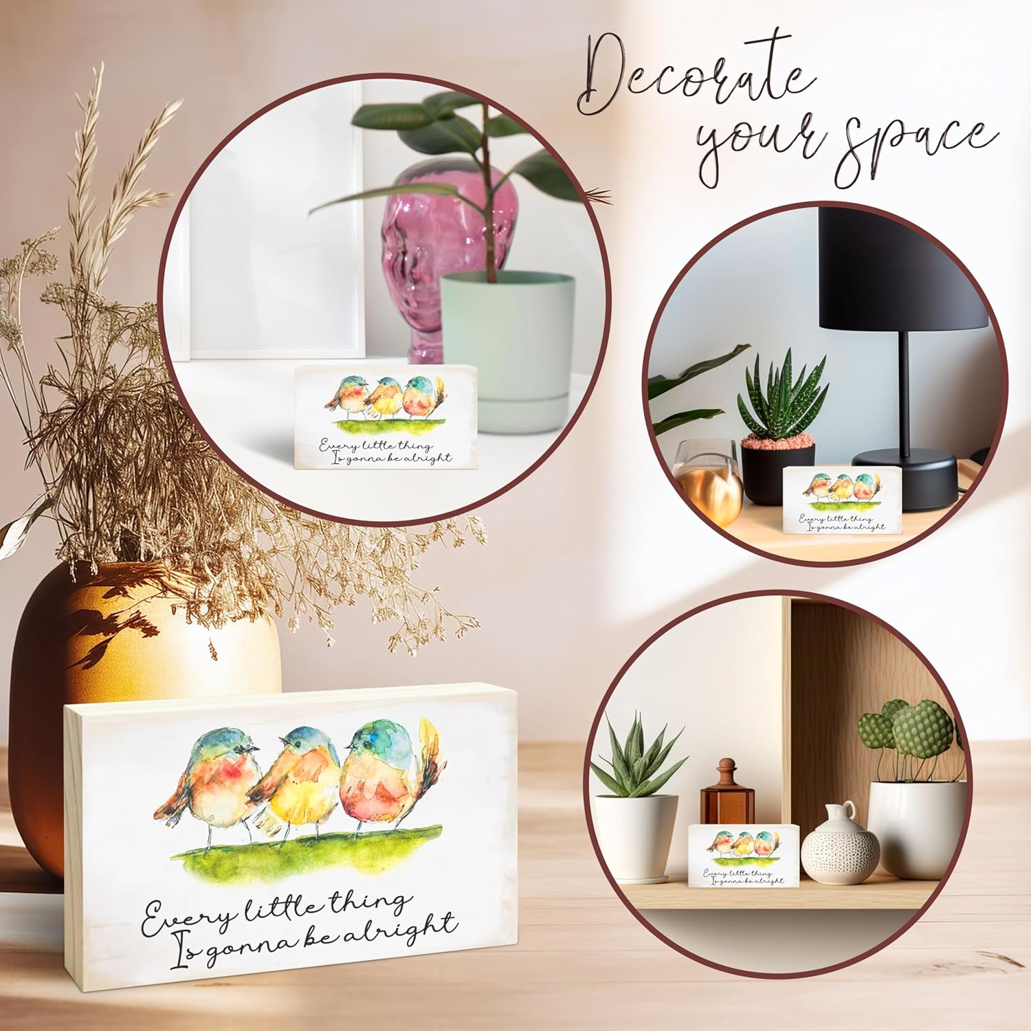 Rustic Pine Wood Block Sign - Every Little Thing Is Gonna Be Alright - Watercolor Birds, Positive Wooden Plaque For Desk Top, Shelf, Gift For Friends, Home & Office Decorations(4 X 6 Inches) - D10