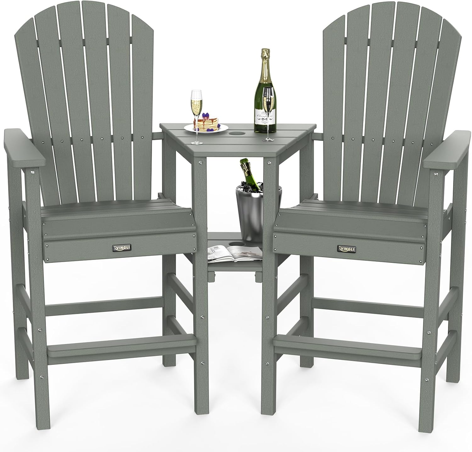 VINGLI Tall Adirondack Chairs Set of 2, HDPE Balcony Chair with Double Connecting Tray Weather Resistant Outdoor Bar Stools for Patio Deck Lawn Pool Backyard (Grey)
