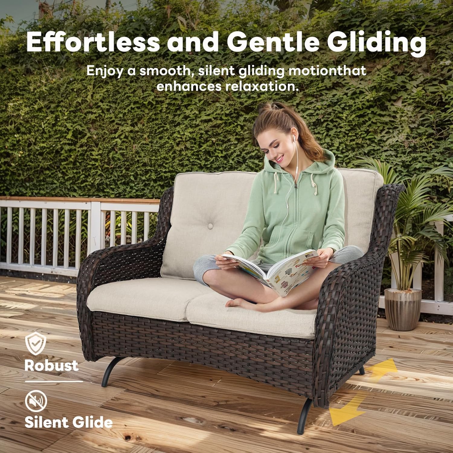 - Smooth Glider Loveseat & Swivel Rocker Chairs: Enjoy the comfort of the cozy loveseat glider chair for two, offering a gentle back-and-forth motion, paired with two swivel rocker outdoor chairs that provide a full 360Β° rotation. These features ensure your wicker patio furniture offers the perfect blend of relaxation and movement for enjoyable outdoor conversations.