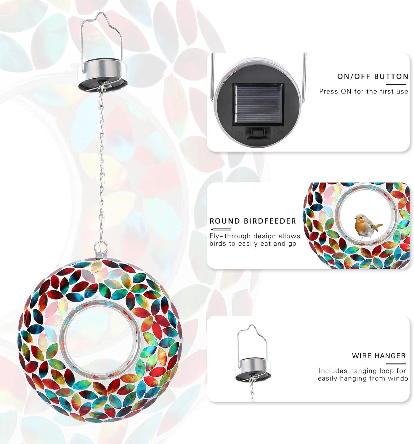 VCUTEKA Mosaic Bird Feeder Solar Fly Through Birdfeeder for Outside Hanging Round Shape Glass Container to Attract More Wild Bird Feeders for Garden Decor as Gift for Bird Lovers, Red 10-Inch