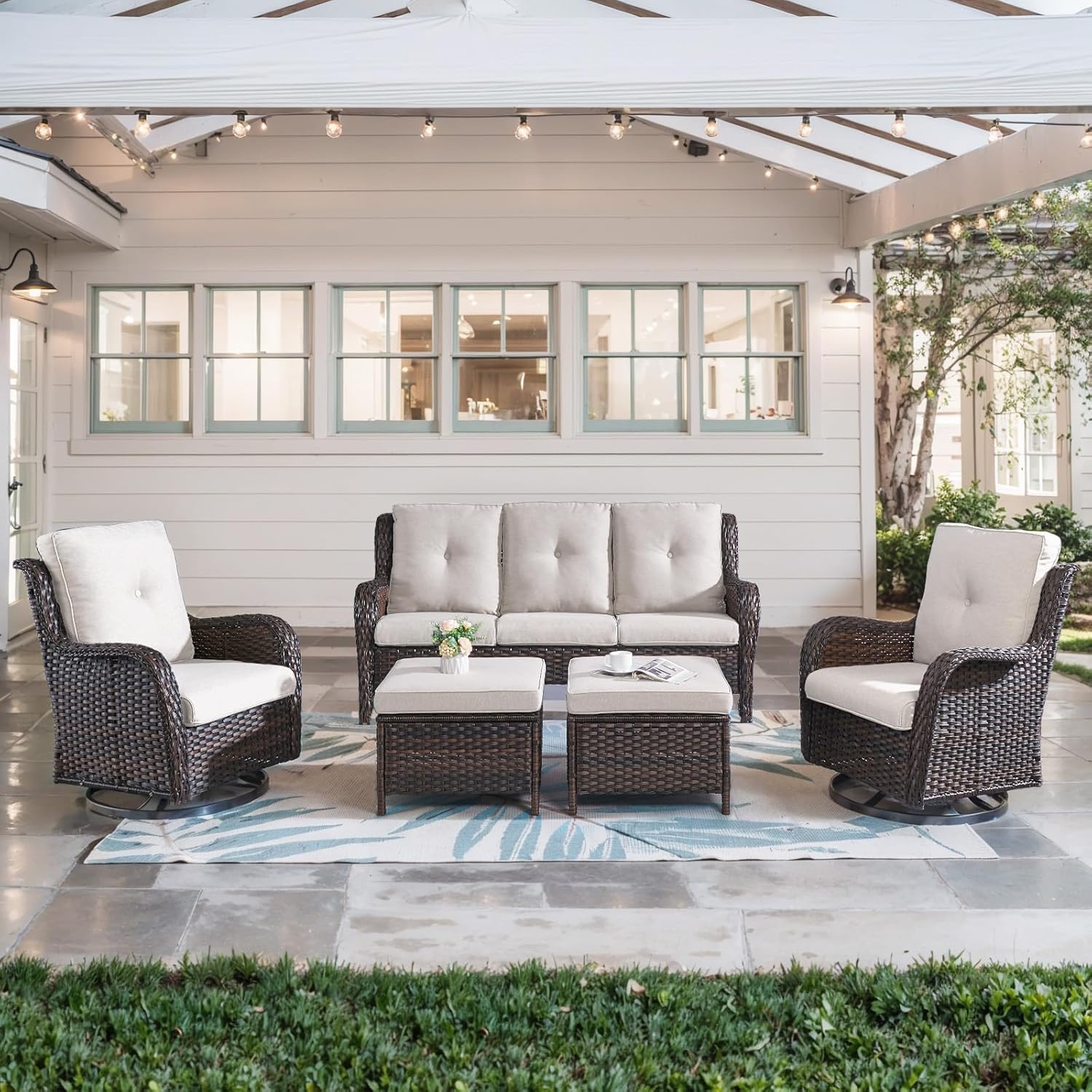 - Patio Furniture Set Introduction: The 5-piece patio furniture set includes 2 swivel glider chairs, 2 ottoman and a sofa, ottoman can not only be used to relax your legs, but also can be used as a small table or small stool. The swivel chairs can hold up to 350 pounds.