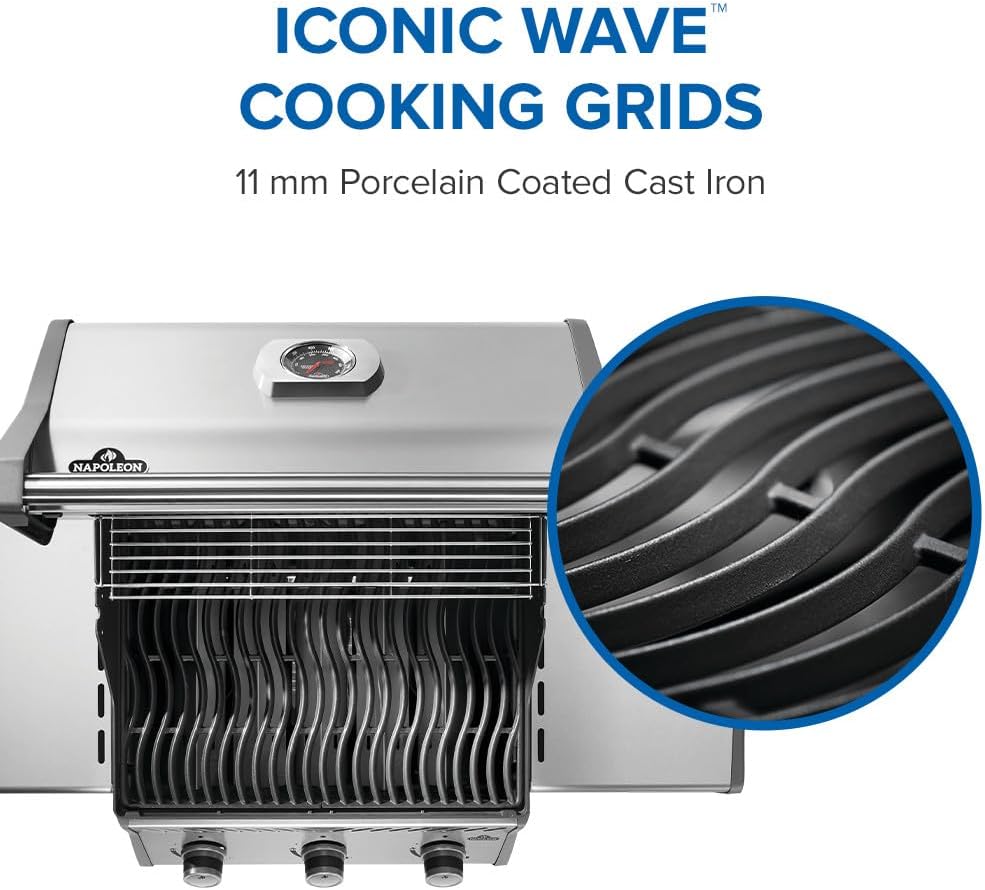 - CAST IRON COOKING GRATES: Porcelainized cast iron cooking grids provide even heating and the perfect sear on food. Reverse grids for larger sear marks, grooves hold juices against food while cooking to retain moisture