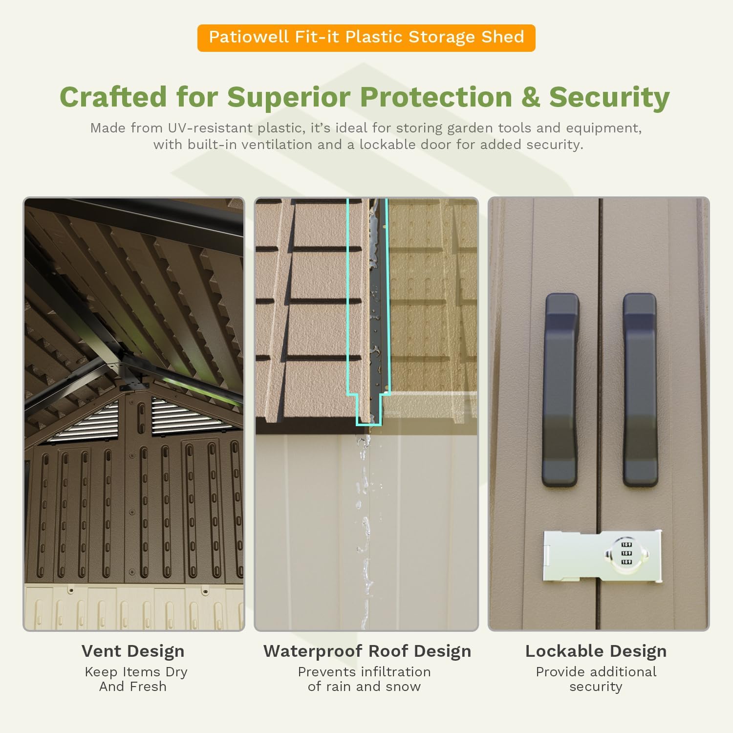 Patiowell 8 x 12 FT Plastic Outdoor Storage Shed with Floor, Resin Shed with Window and Lockable Door for Garden, Backyard, Tool Storage Use, Easy to Install in Brown (Kick-it Shed)