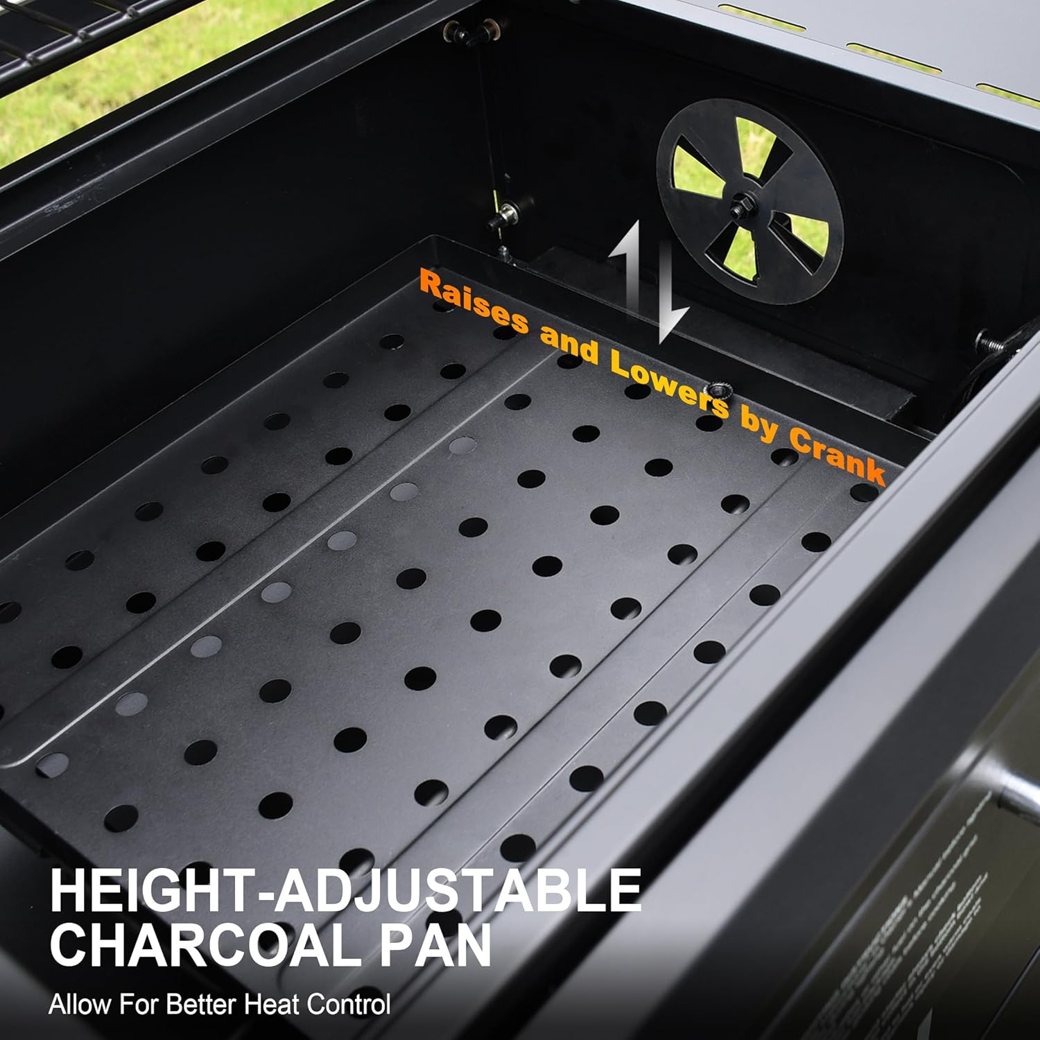 - OPTIMIZED AIRFLOW: Our grill's lid-mounted chimney and side damper ensure excellent airflow, reducing heat loss and giving you control over the flame. Adjust the charcoal pan height for perfect heat distribution and grilling results every time