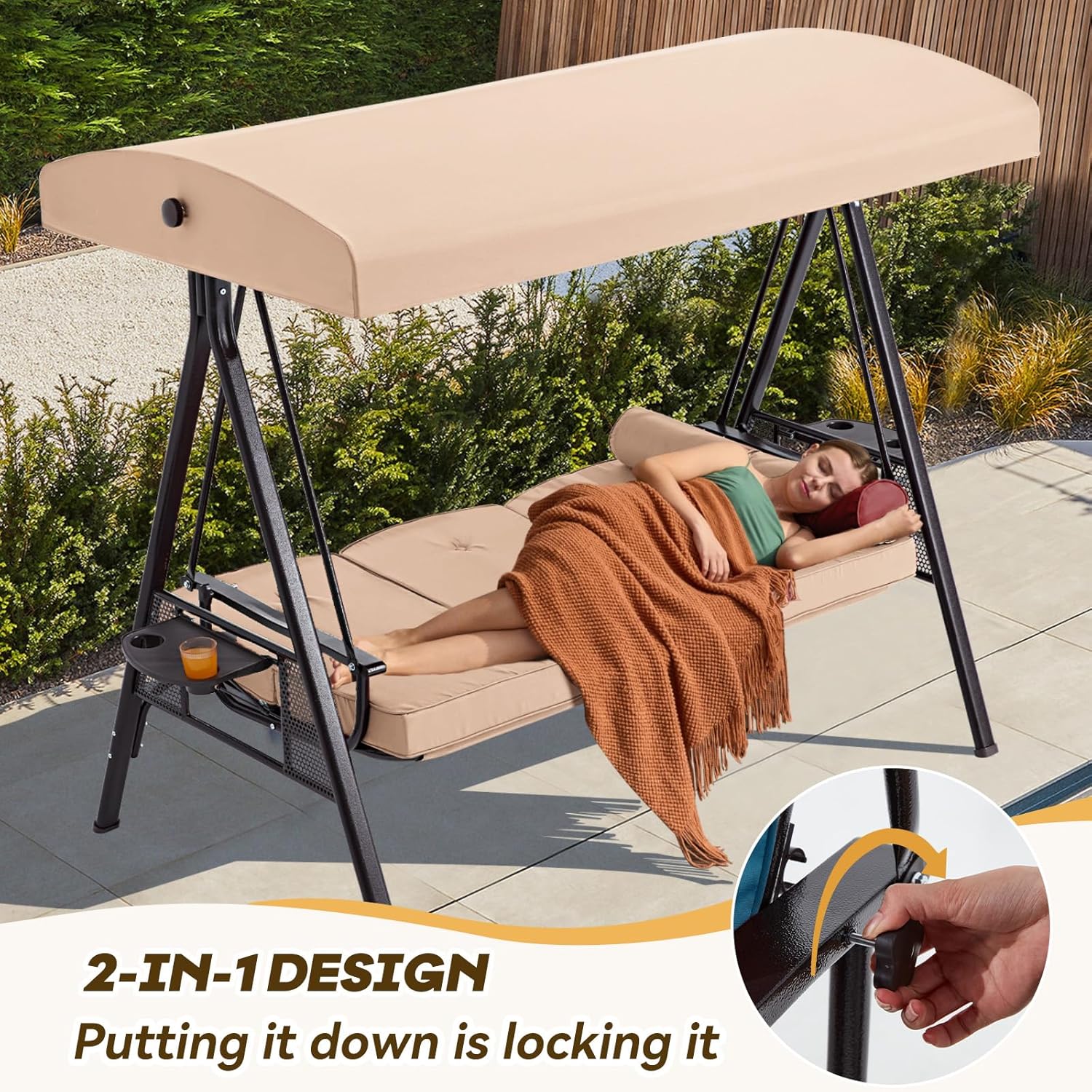 - 【3 in 1 Bed with 3 Seats】: This porch swing chair can be converted into a porch swing bed. Patio swing with stand 3 in 1 design provides the bigger place for resting, napping, or basking in the sun. Once the backrest of yard swing is lowered, it securely locks in place, ensuring outdoor porch swing stability without unnecessary swaying.