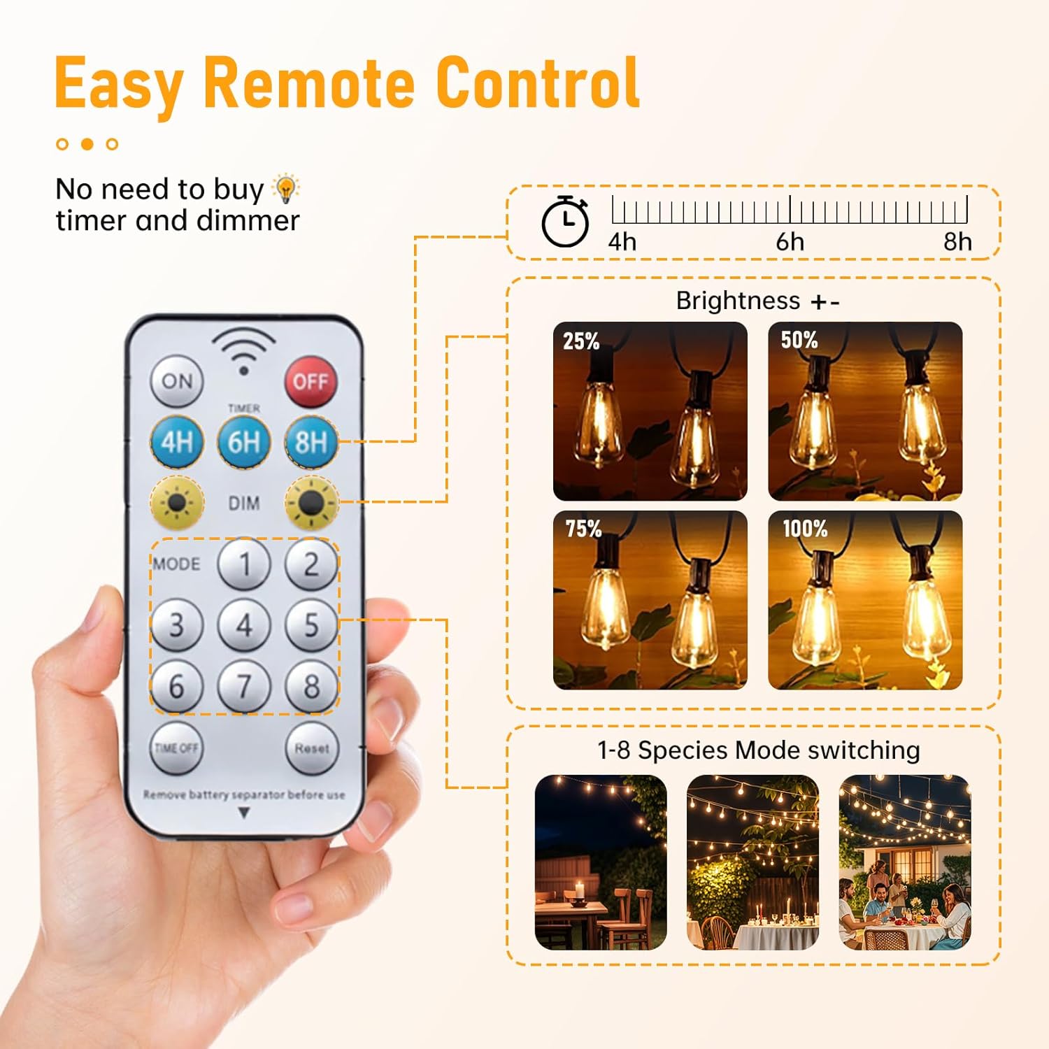 - 【Dimmer Compatible】: Our solar lights outdoor are perfectly compatible with a dimmer and support remote dimming for brightness control, committed to providing greater mood lighting flexibility and a soft glow, to create the perfect atmosphere for a bistro deck porch patio garden backyard terrace pergola or wedding party banquets